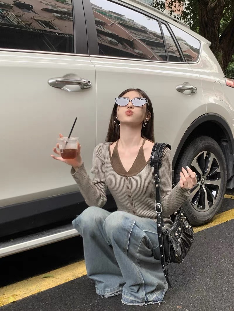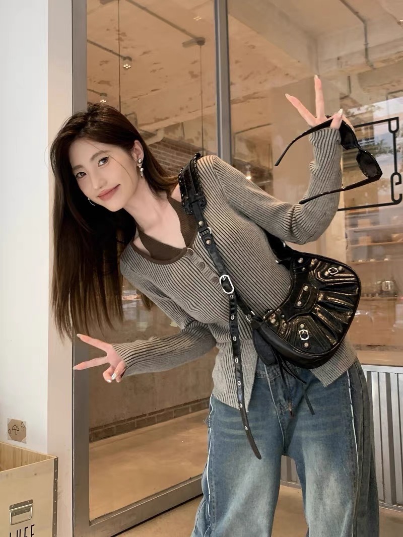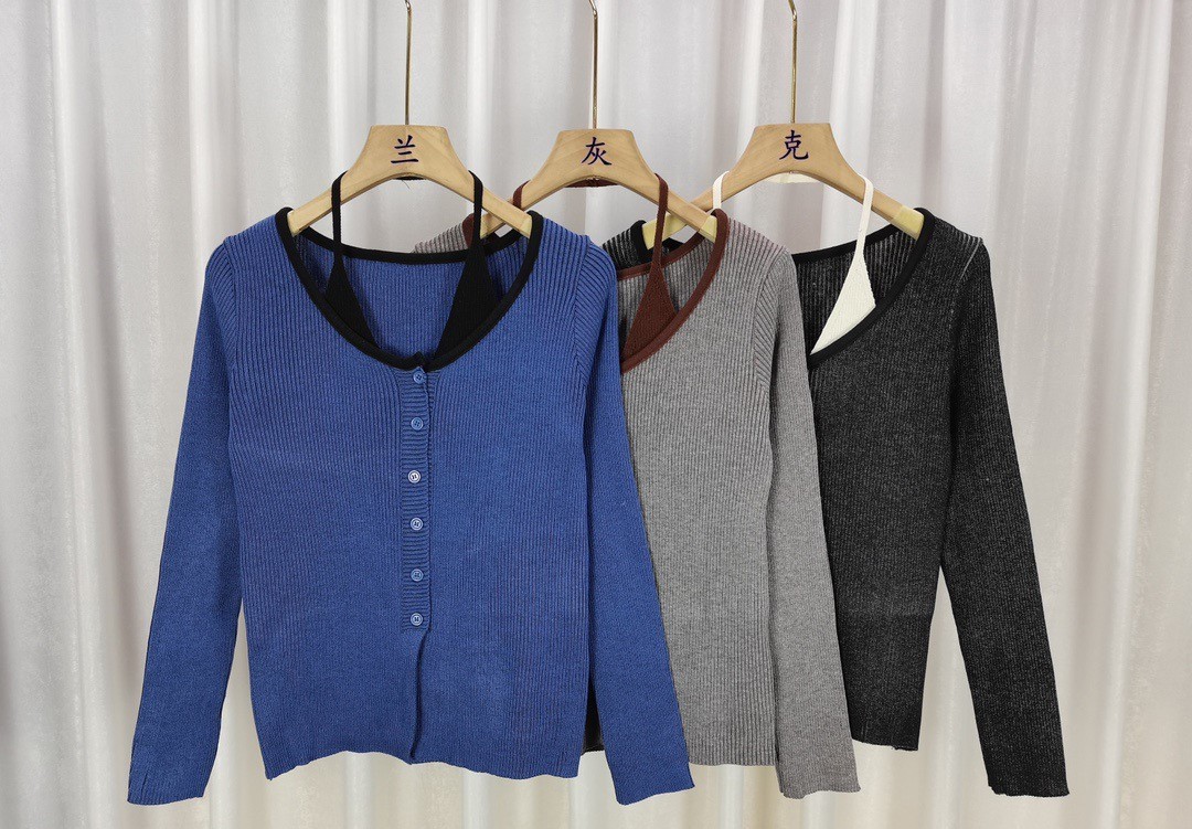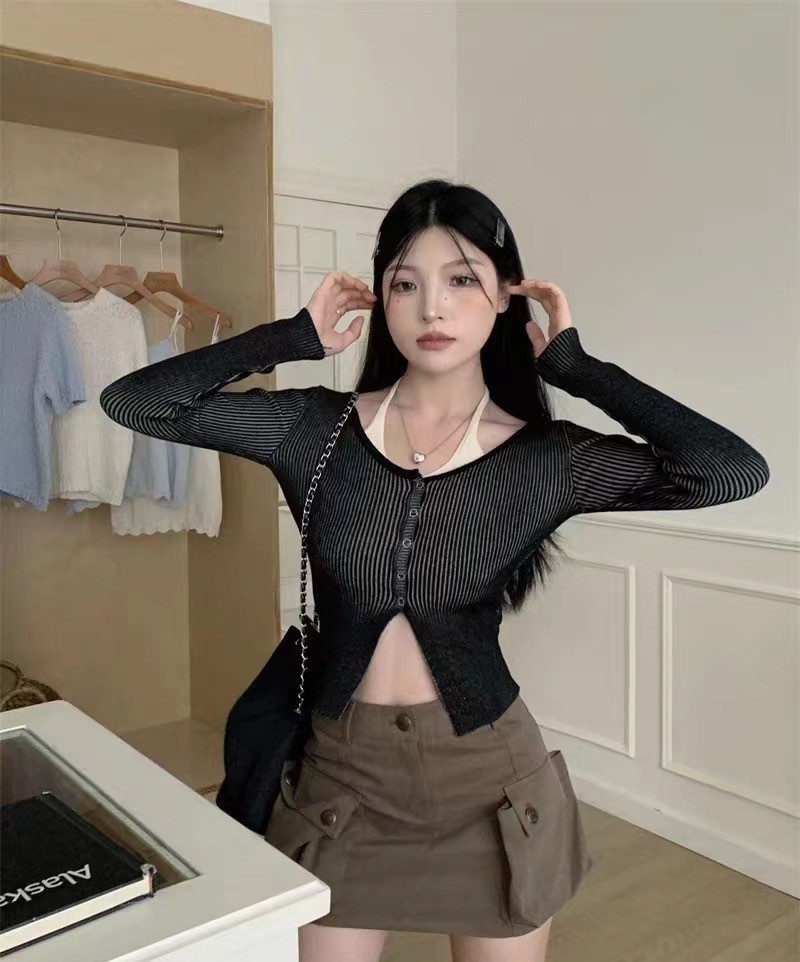 2023 가을과 겨울 디자인 슬림 핏 슬리밍 탑 프랑스 가짜 투피스 스트라이프 홀터 긴 소매 스웨터 여성용스토어 가기