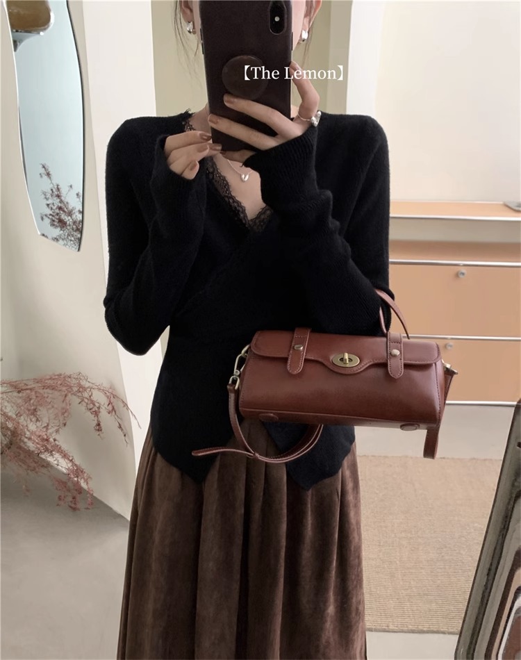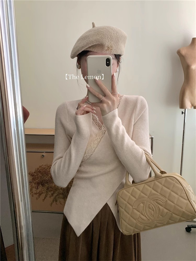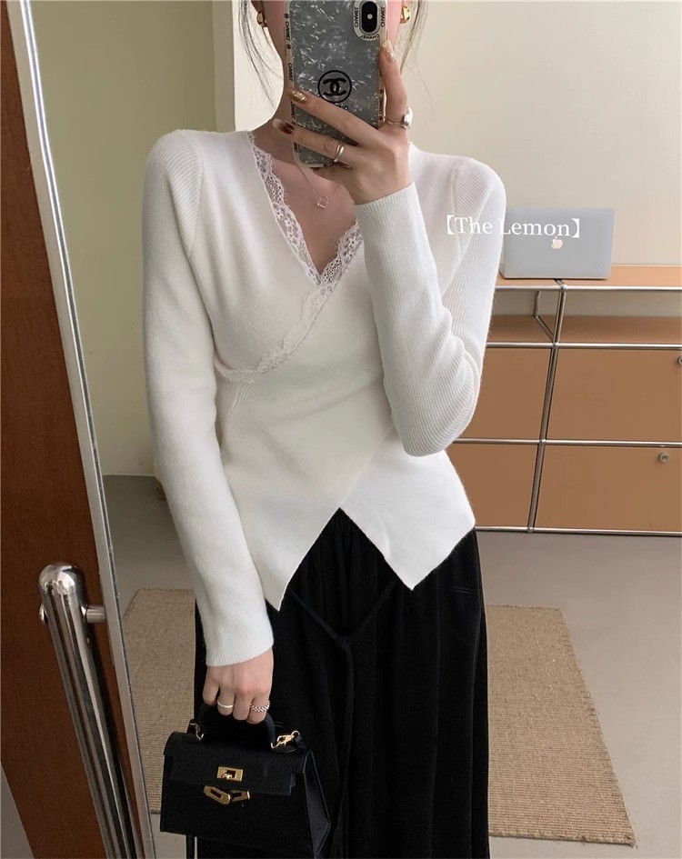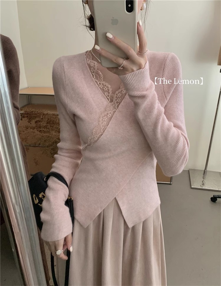 프랑스 스타일 니트웨어 여성 최고 봄 새로운 V 넥 스티칭 레이스 디자인 바닥 셔츠 기질 크로스 스웨터스토어 가기
