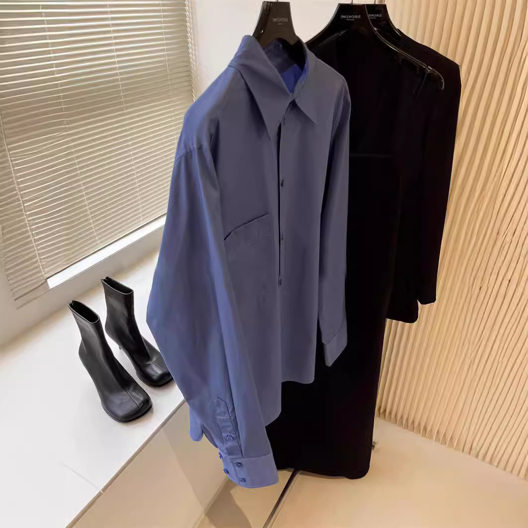 염색 된 프렌치 블루 백 곡선 모양 느슨하고 편안한 더블 로우 커프스 단추 머서라이즈면 셔츠스토어 가기