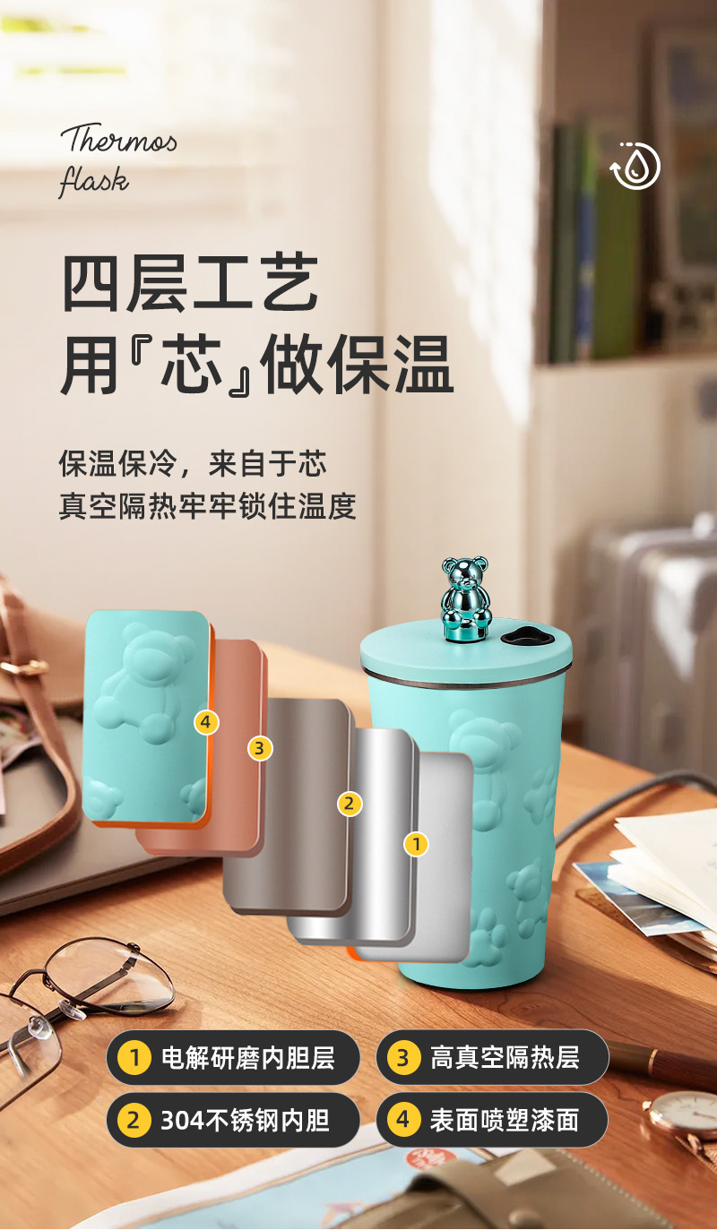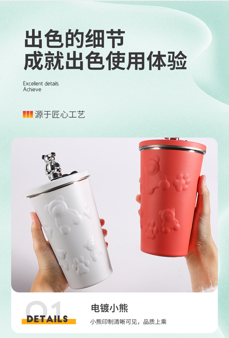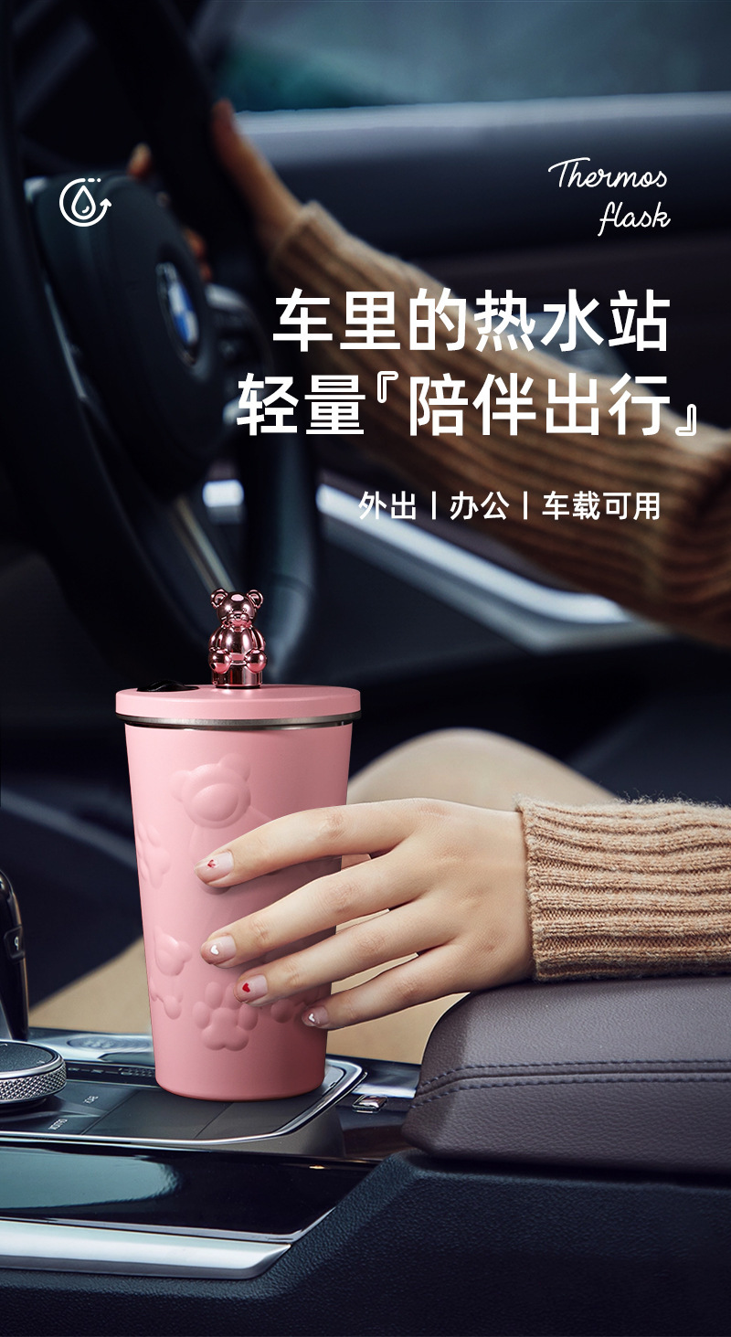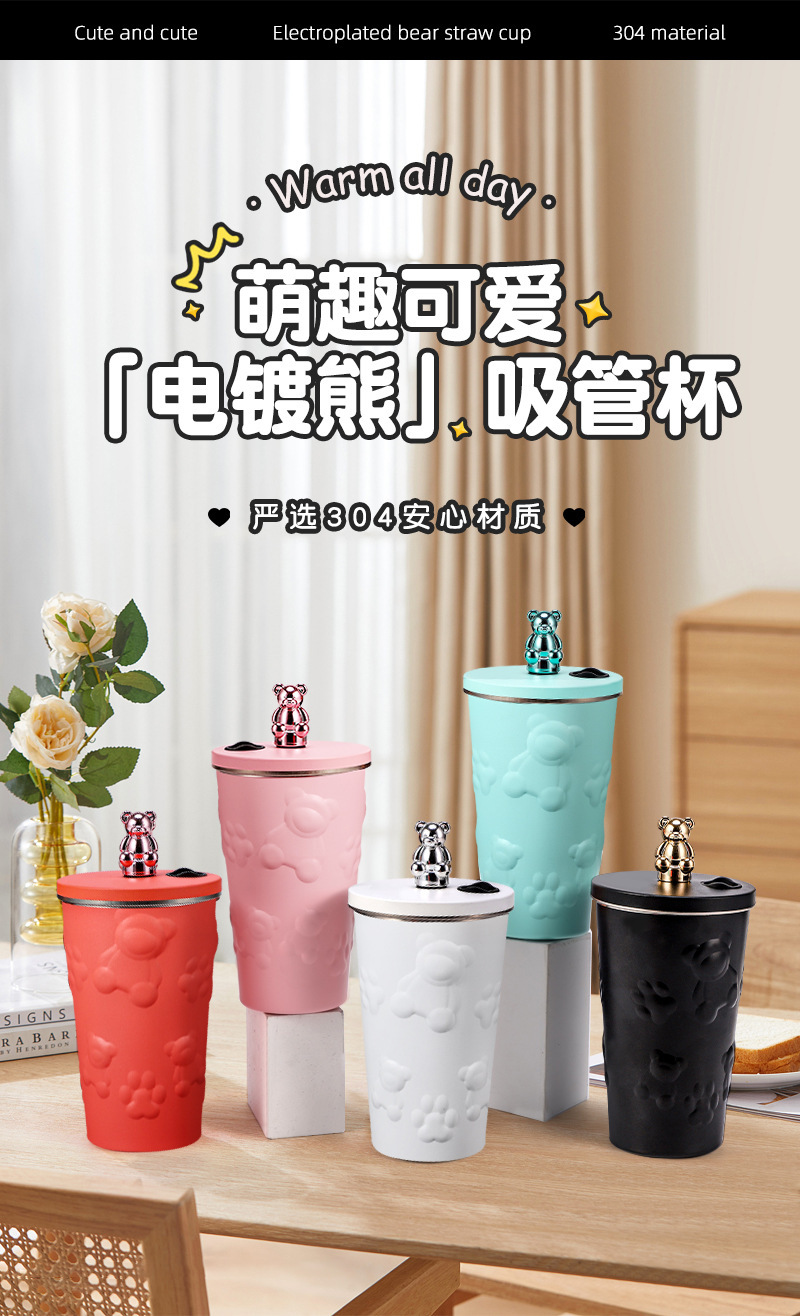 국경 새로운 만화 전기 도금 곰 304 스테인레스 스틸 절연 커피 컵 자동차 휴대용 진공 흡입 컵 선물스토어 가기