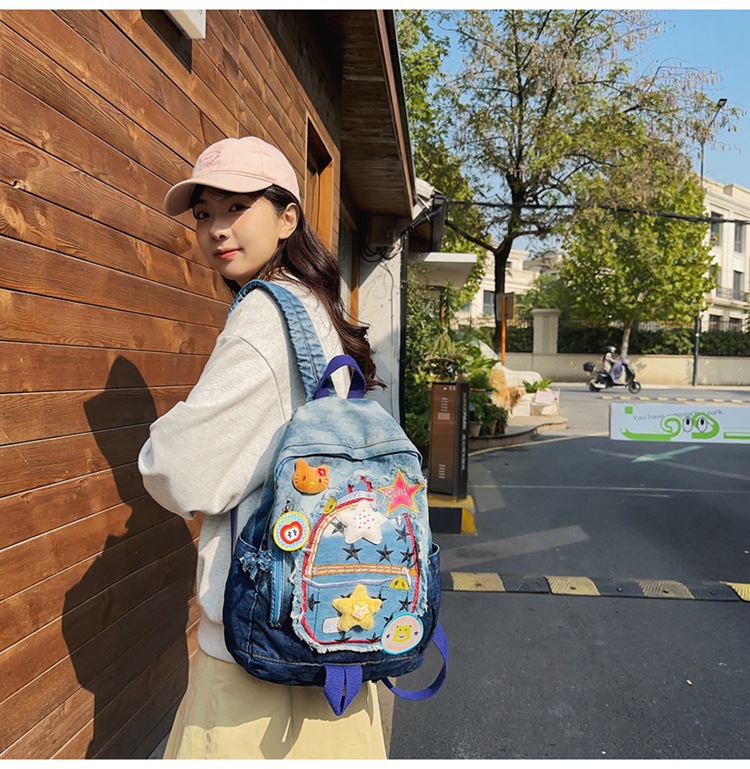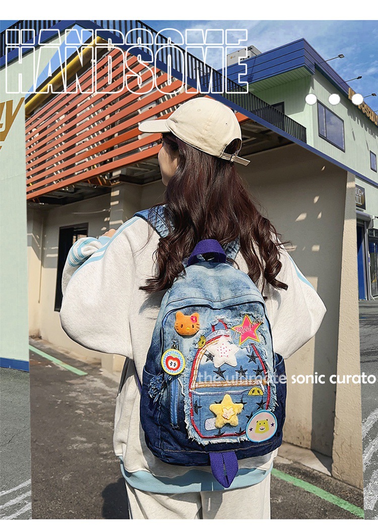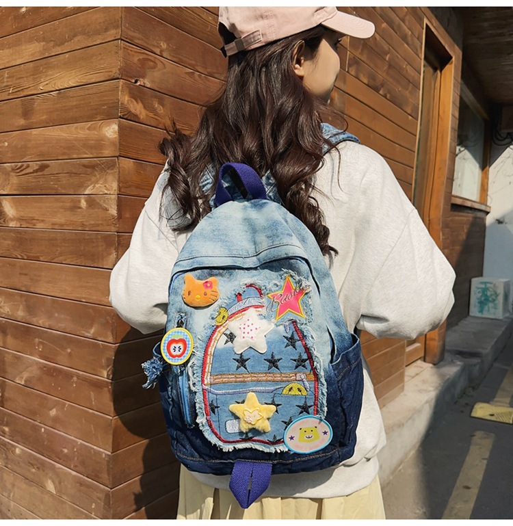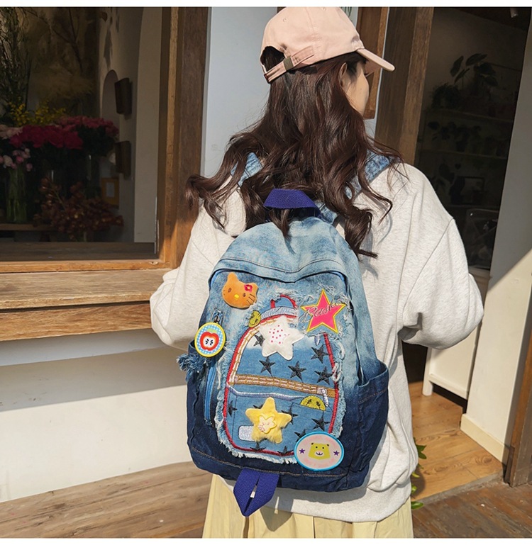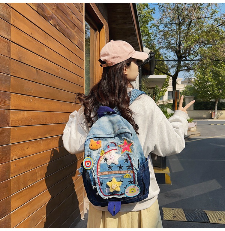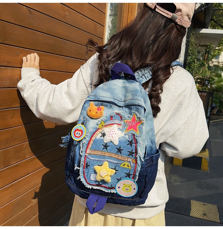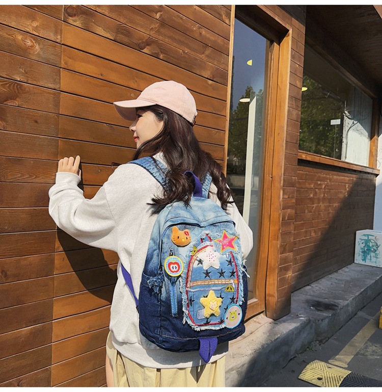 홈 메이드 스타 스티커 데님 그라디언트 컬러 스쿨 백 만화 고양이 달콤한 귀여운 올 매치 백팩 초등 및 중등 학생스토어 가기