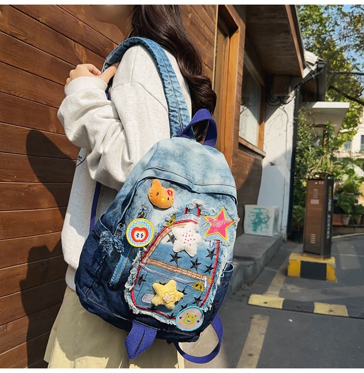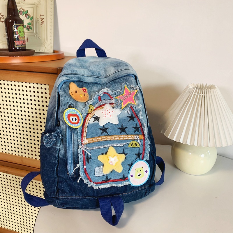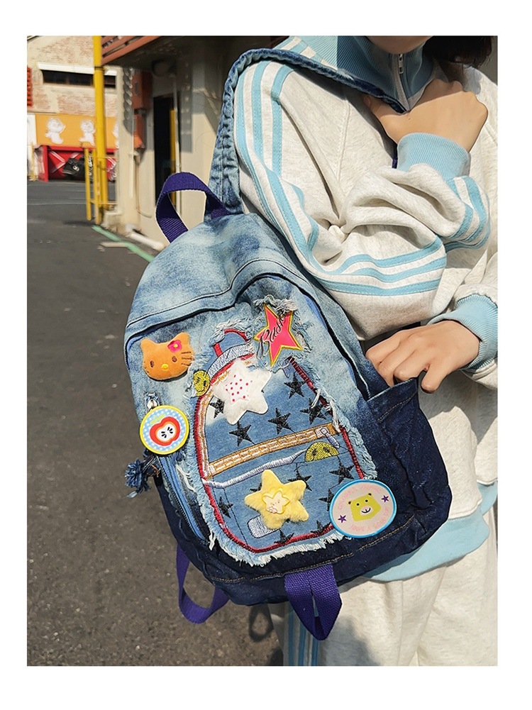 홈 메이드 스타 스티커 데님 그라디언트 컬러 스쿨 백 만화 고양이 달콤한 귀여운 올 매치 백팩 초등 및 중등 학생