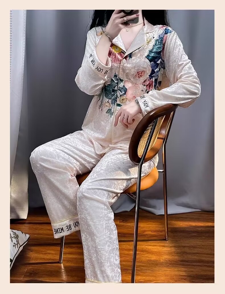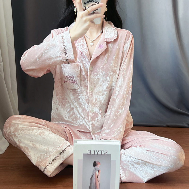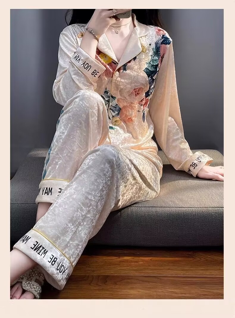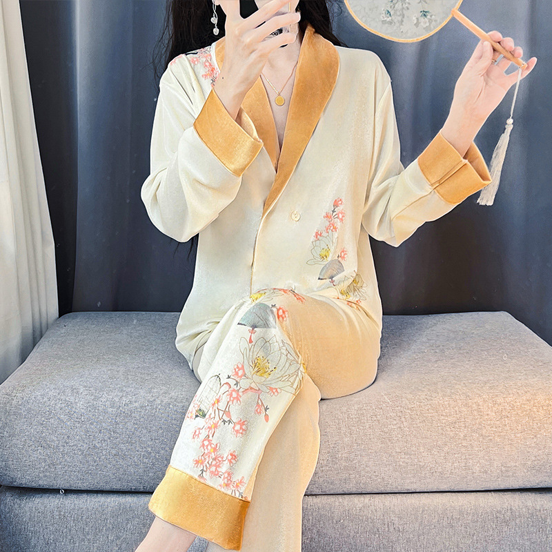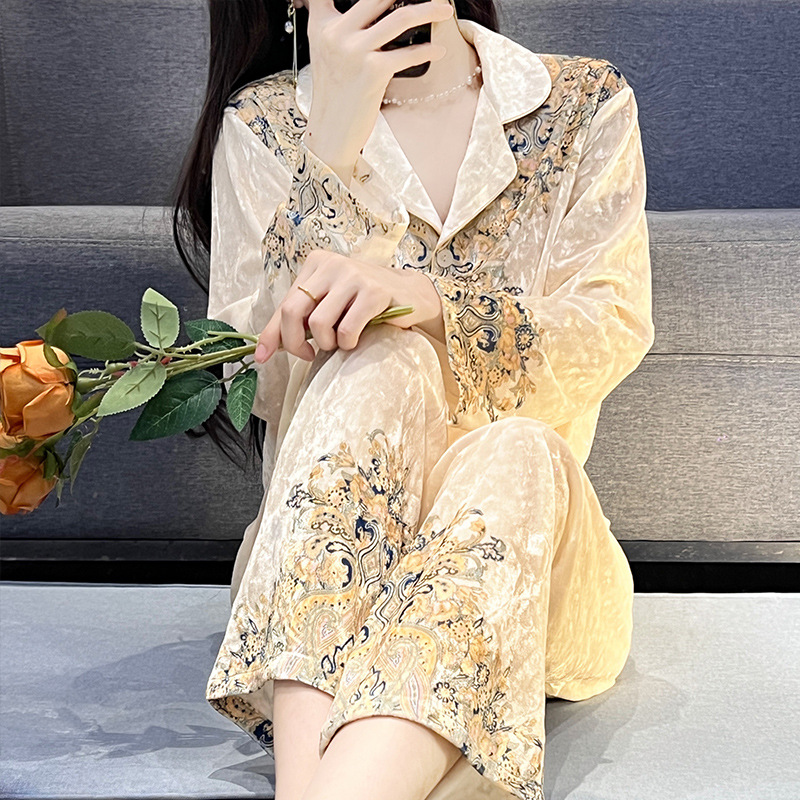 뜨거운 가을과 겨울 골드 다이아몬드 벨벳 파자마 여성 카디건 모란 고급 골드 벨벳 따뜻한 가정복 세트