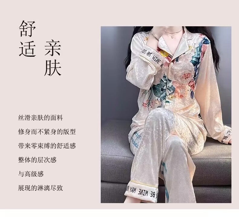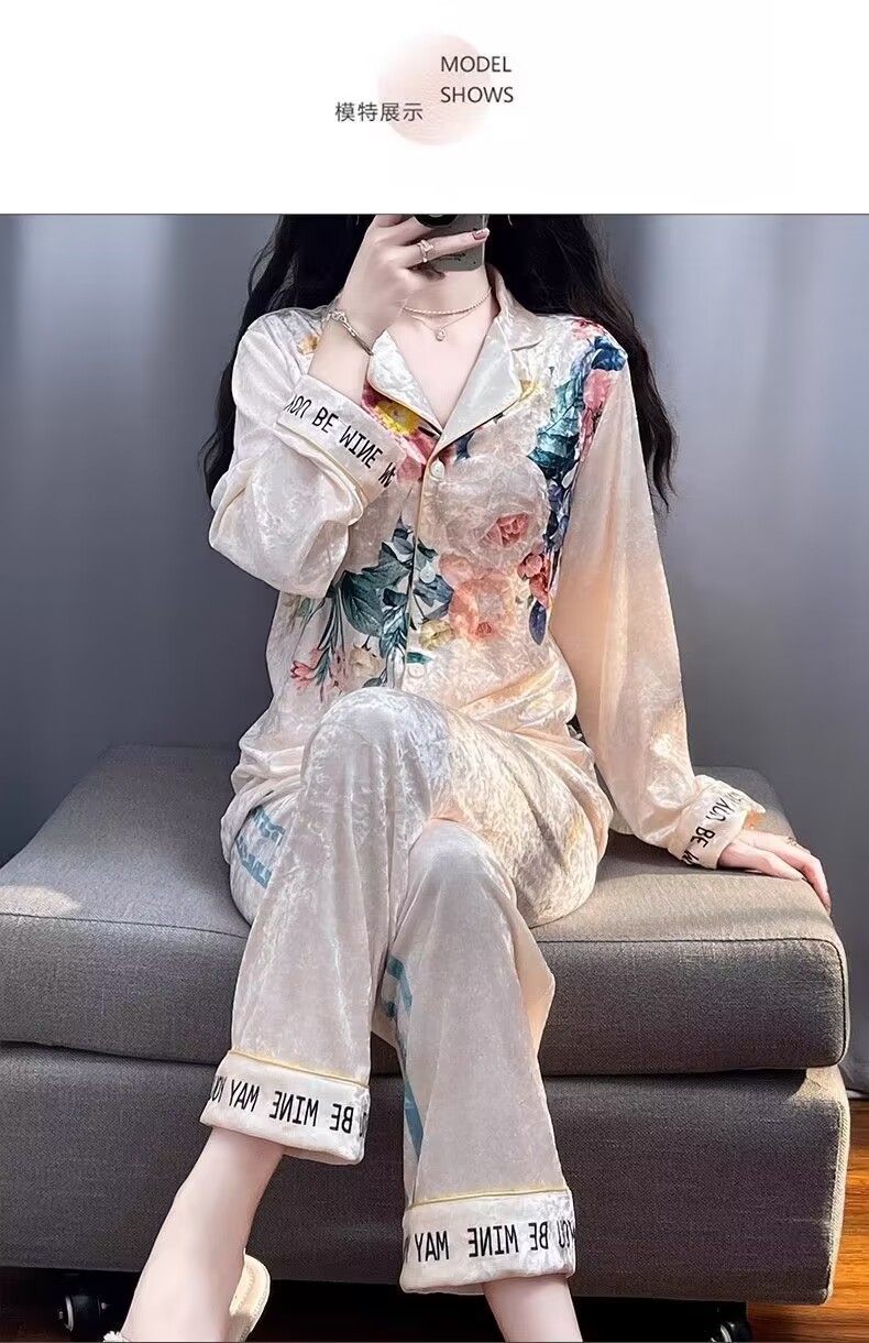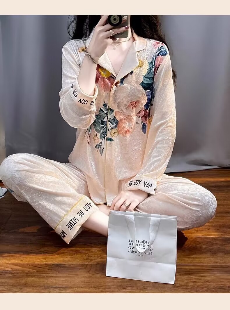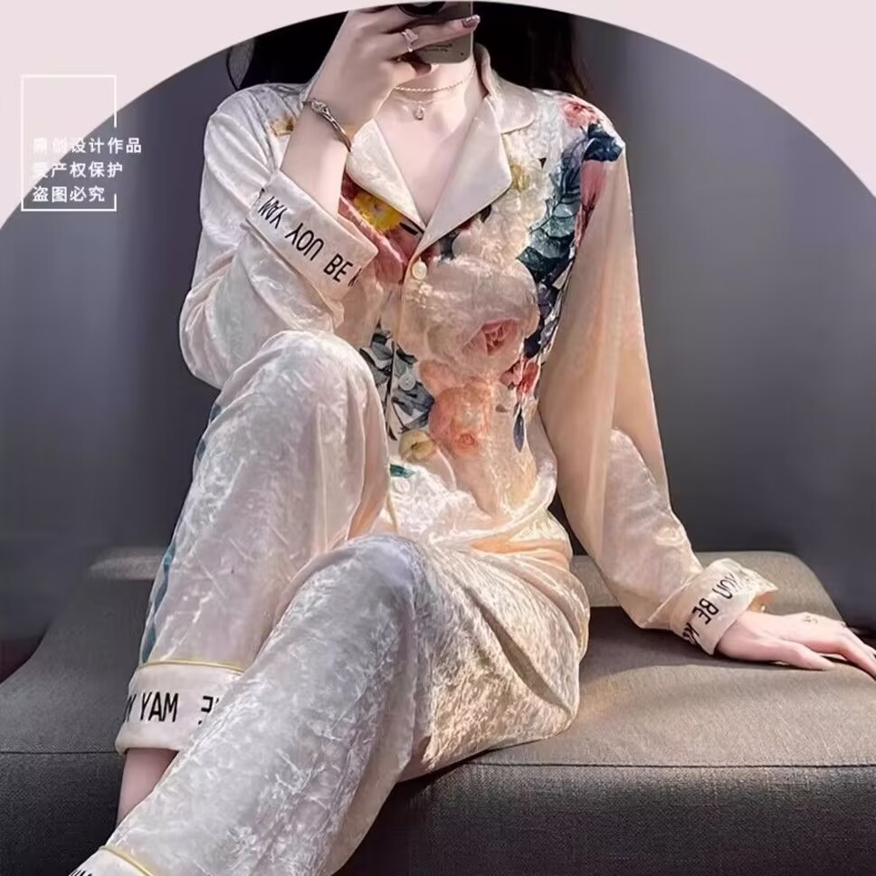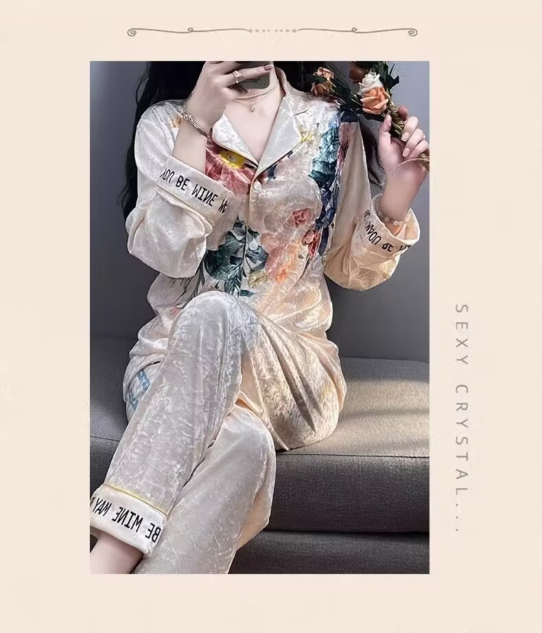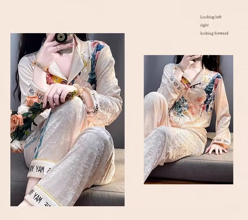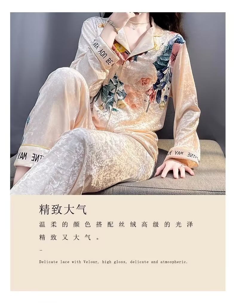 뜨거운 가을과 겨울 골드 다이아몬드 벨벳 파자마 여성 카디건 모란 고급 골드 벨벳 따뜻한 가정복 세트스토어 가기