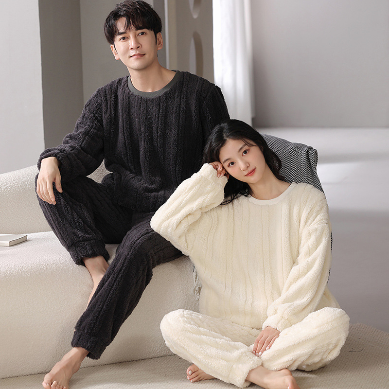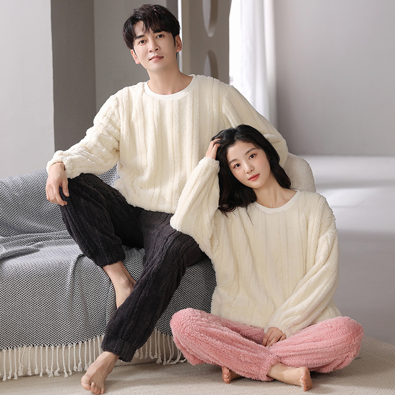 커플 잠옷 겨울 산호 양털 겨울 남자 여자 두껍게 기모 플란넬 둥근 목 홈 착용 가을과 겨울