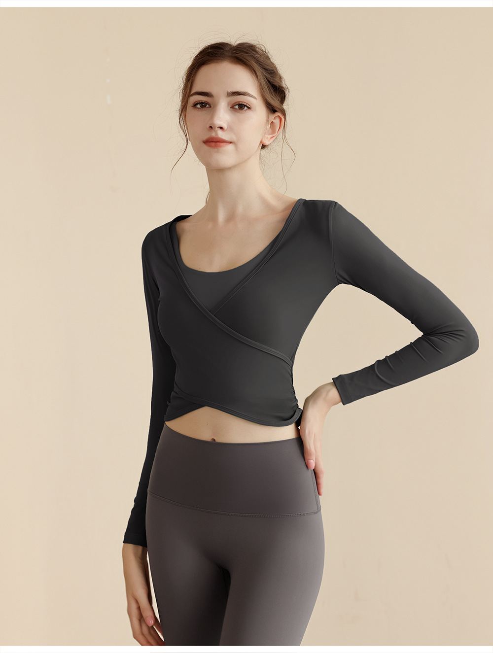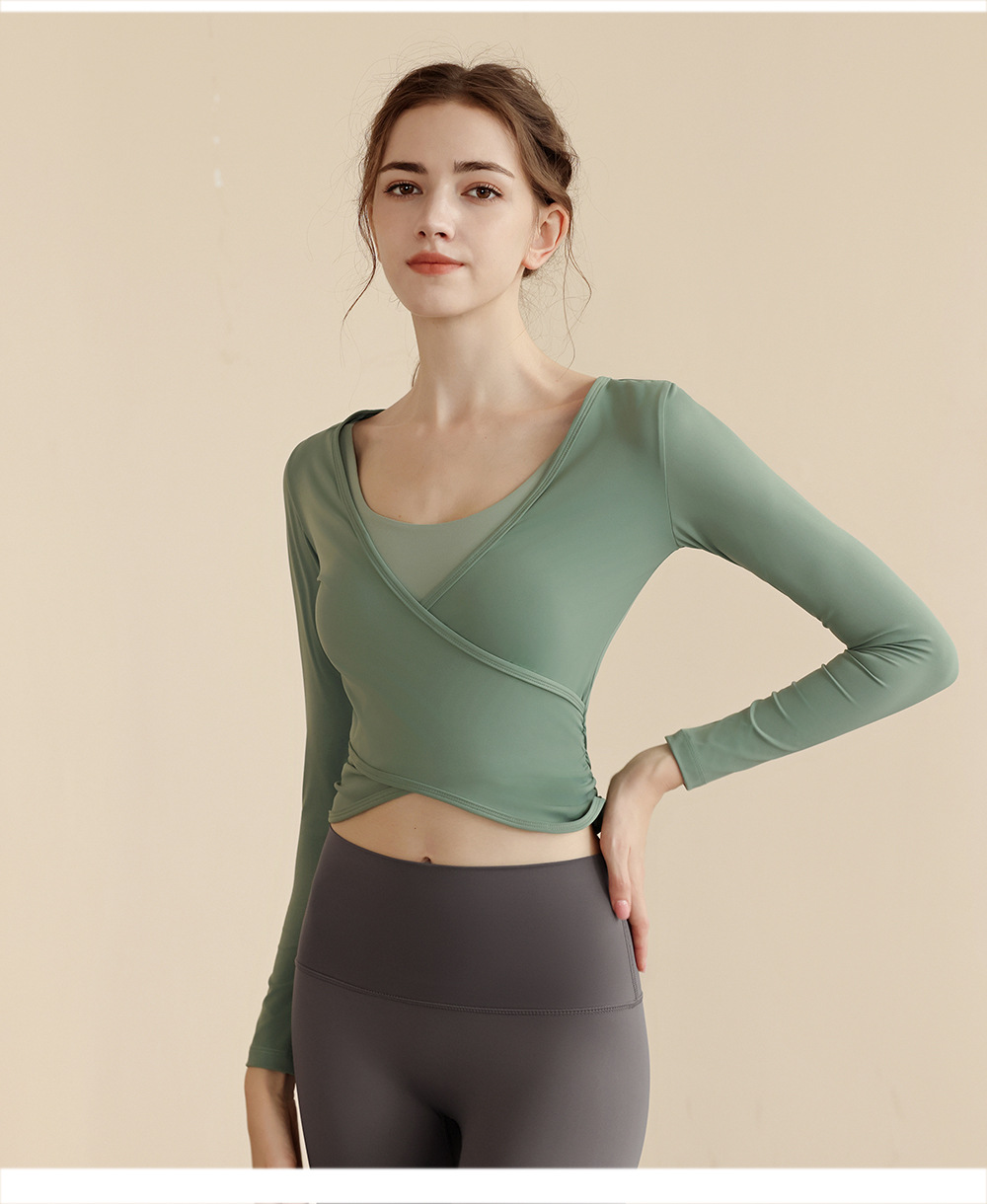 23023 가을 새로운 요가 긴팔 오버셔츠 나일론 벌거 벗은 편안한 패브릭 피트니스 옷 머리카락 한 세대