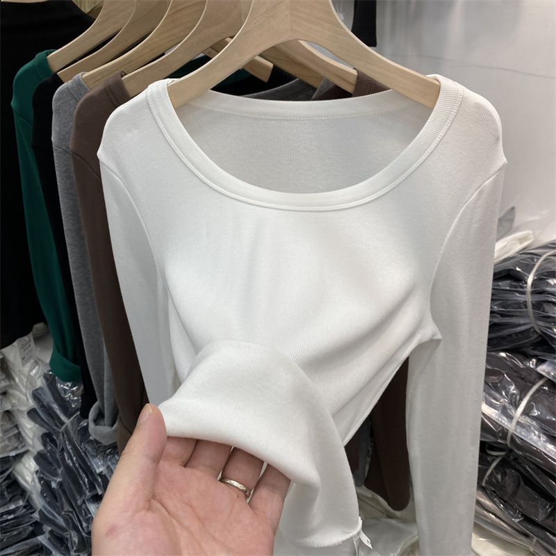 코튼 대형 라운드 넥 긴팔 티셔츠 여성 이너 탑 2023 가을과 겨울 새로운 기모 두껍게 된 슬림 바닥 셔츠