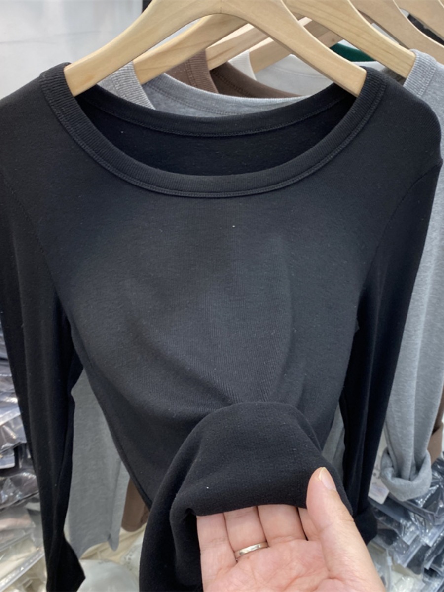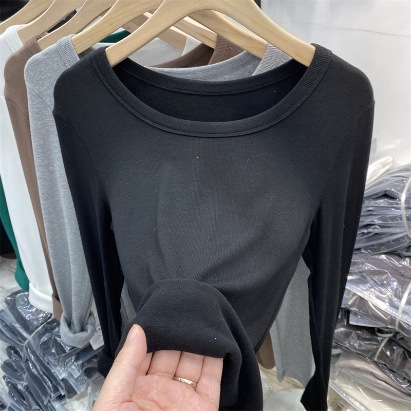 코튼 대형 라운드 넥 긴팔 티셔츠 여성 이너 탑 2023 가을과 겨울 새로운 기모 두껍게 된 슬림 바닥 셔츠스토어 가기
