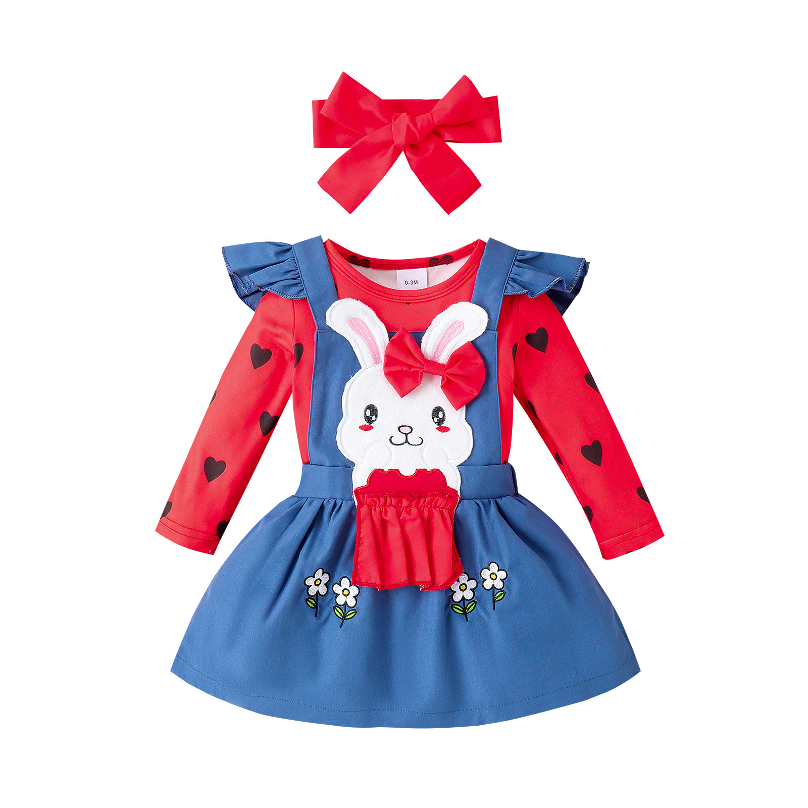 바옥신 아동복 가을 국경 새로운 유럽과 미국의 아기 소녀의 사랑 토끼 원피스 토끼 가닥 스커트, 머리띠 3 피스 세트