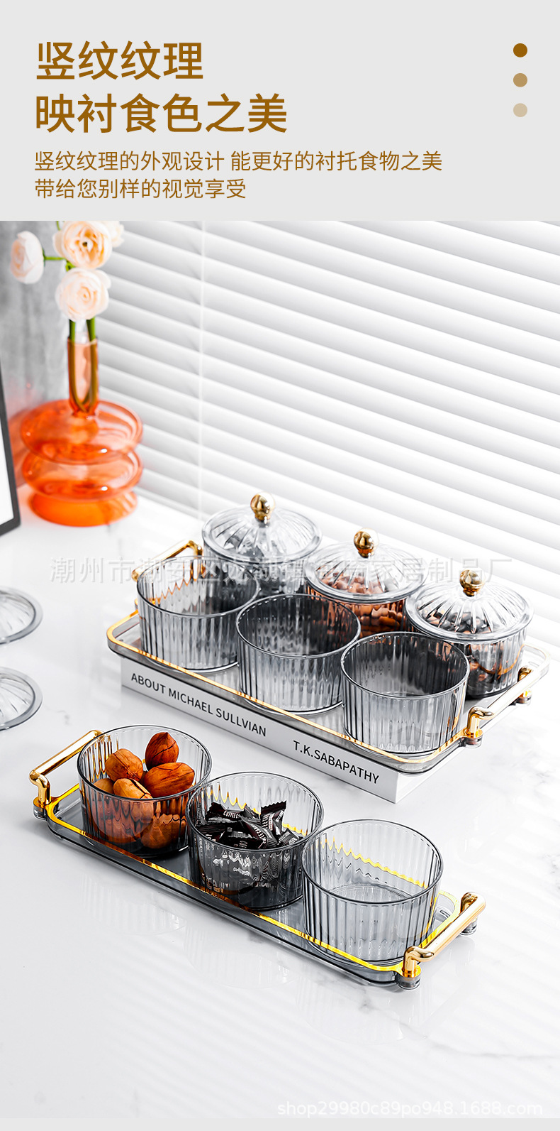 • PS 골드 스모키 그레이 뚜껑이있는 3 라운드 접시 + 3 그리드 작은 귀 플레이트 골드 비즈
