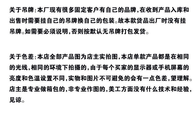 关于退换货:请各位买家下单前务必仔细看一下包包的详情图片,看好之后建议*少量进货,尽量不要因为一些非质量问题退换货(比如包包的大小、色差之类的)。