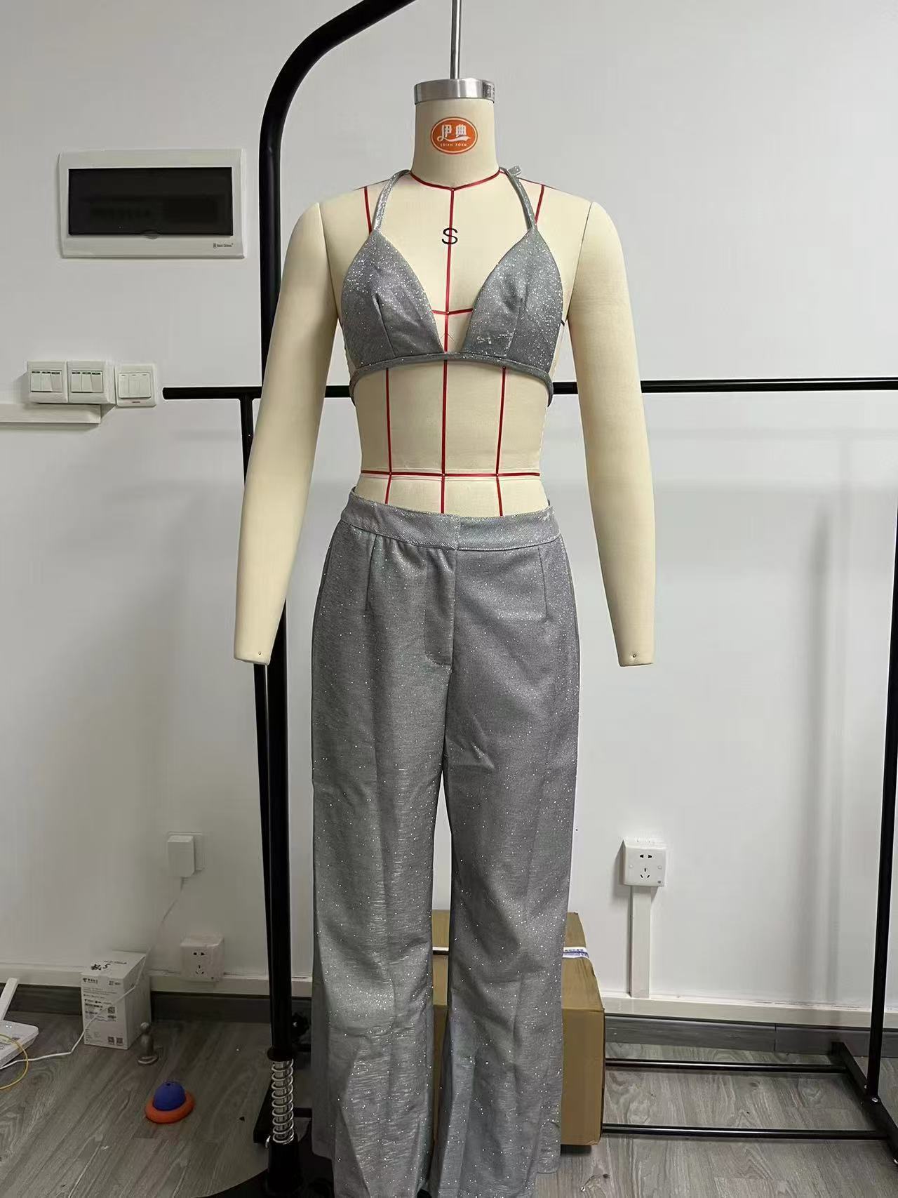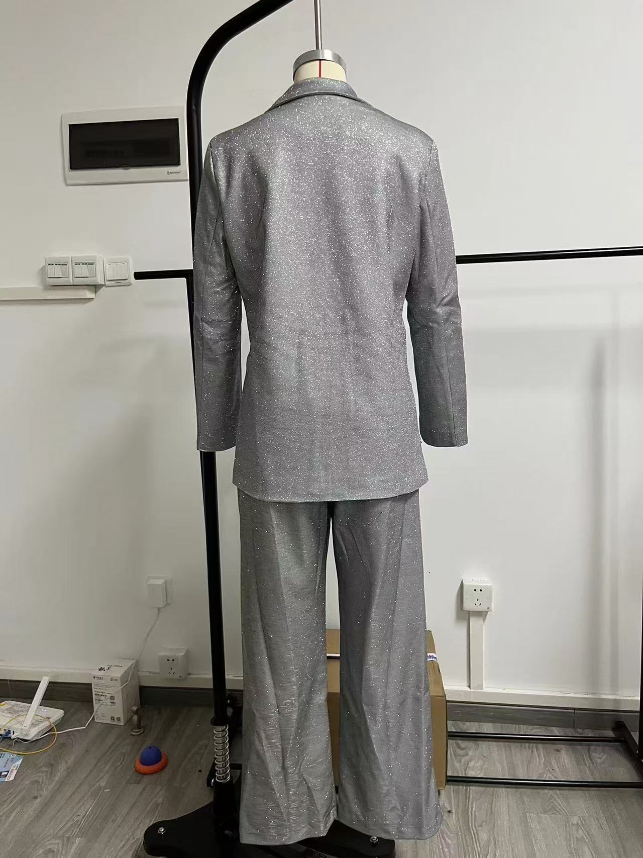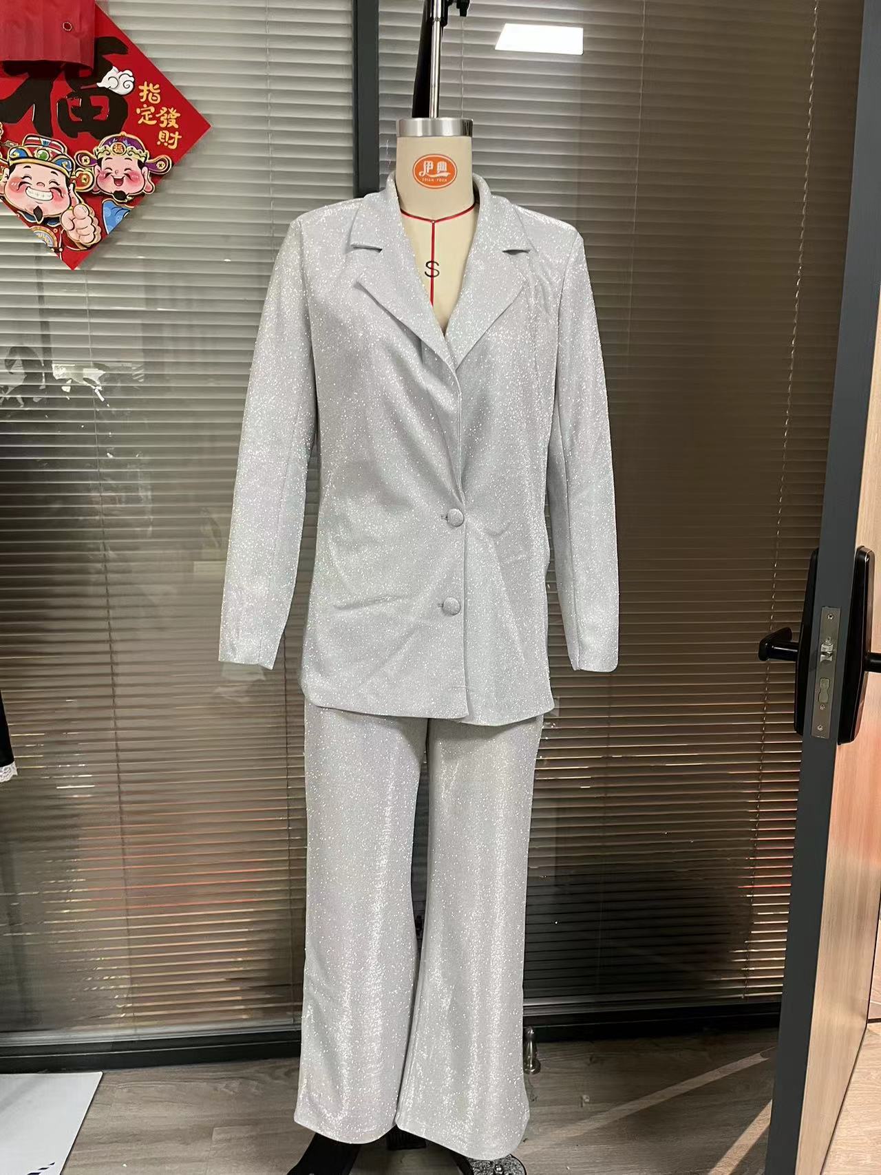 봄과 여름 새로운 대외 무역 여성 의류 유럽과 미국의 뜨거운 판매 단색 스팽글 패션 캐주얼 세트 셔츠 속옷 스트레이트 바지