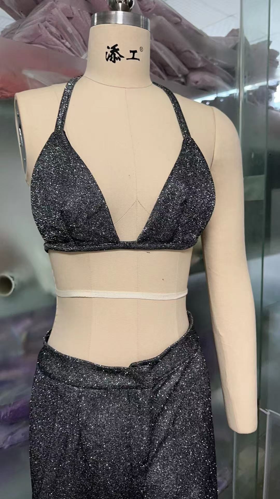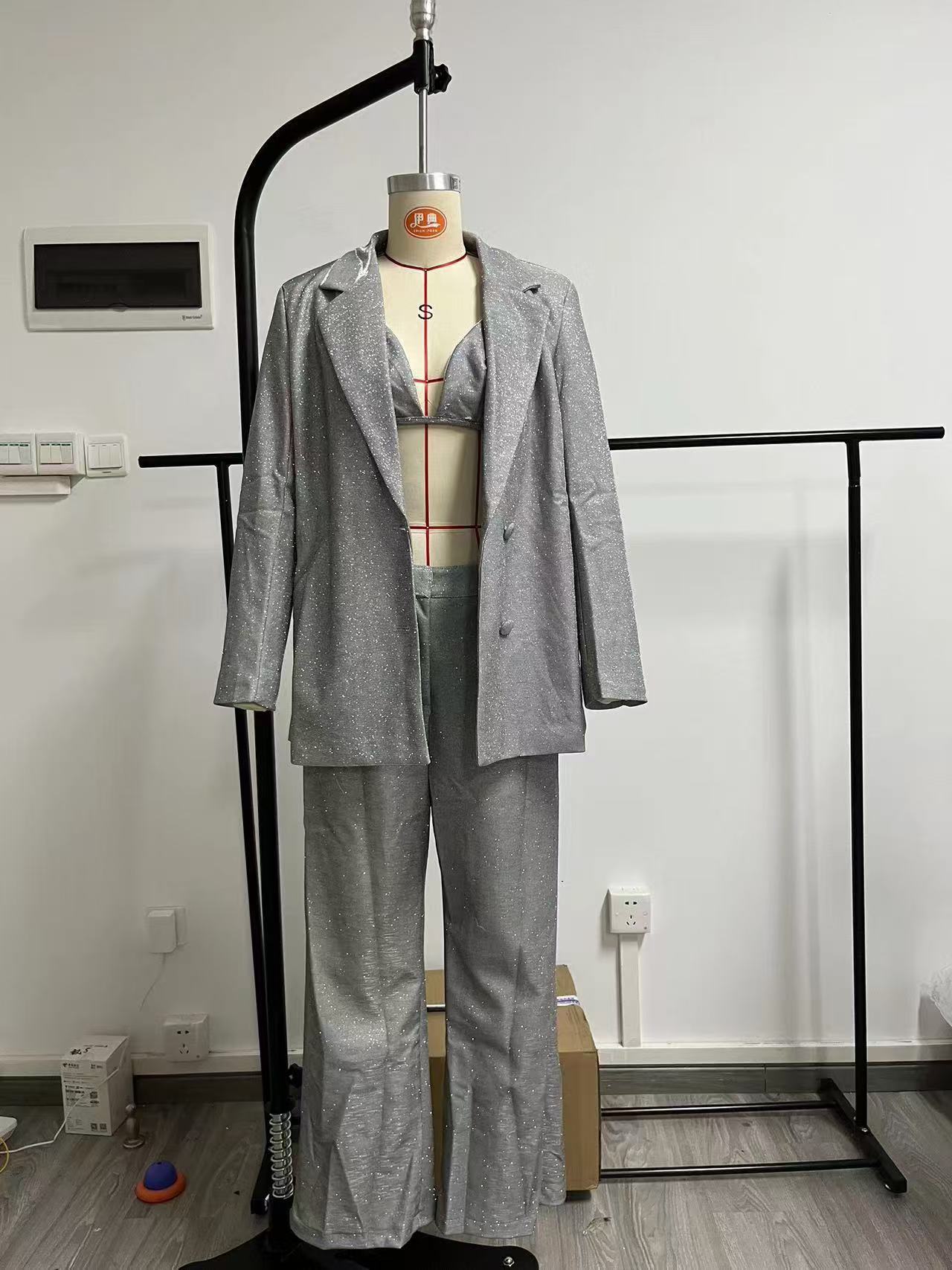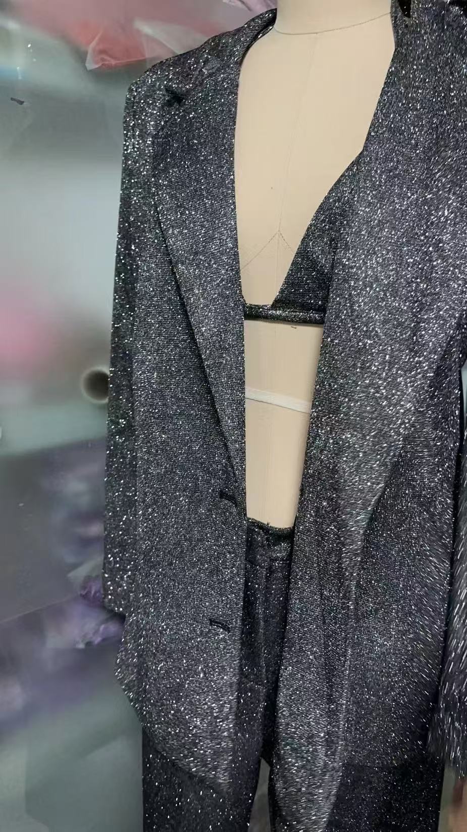 봄과 여름 새로운 대외 무역 여성 의류 유럽과 미국의 뜨거운 판매 단색 스팽글 패션 캐주얼 세트 셔츠 속옷 스트레이트 바지