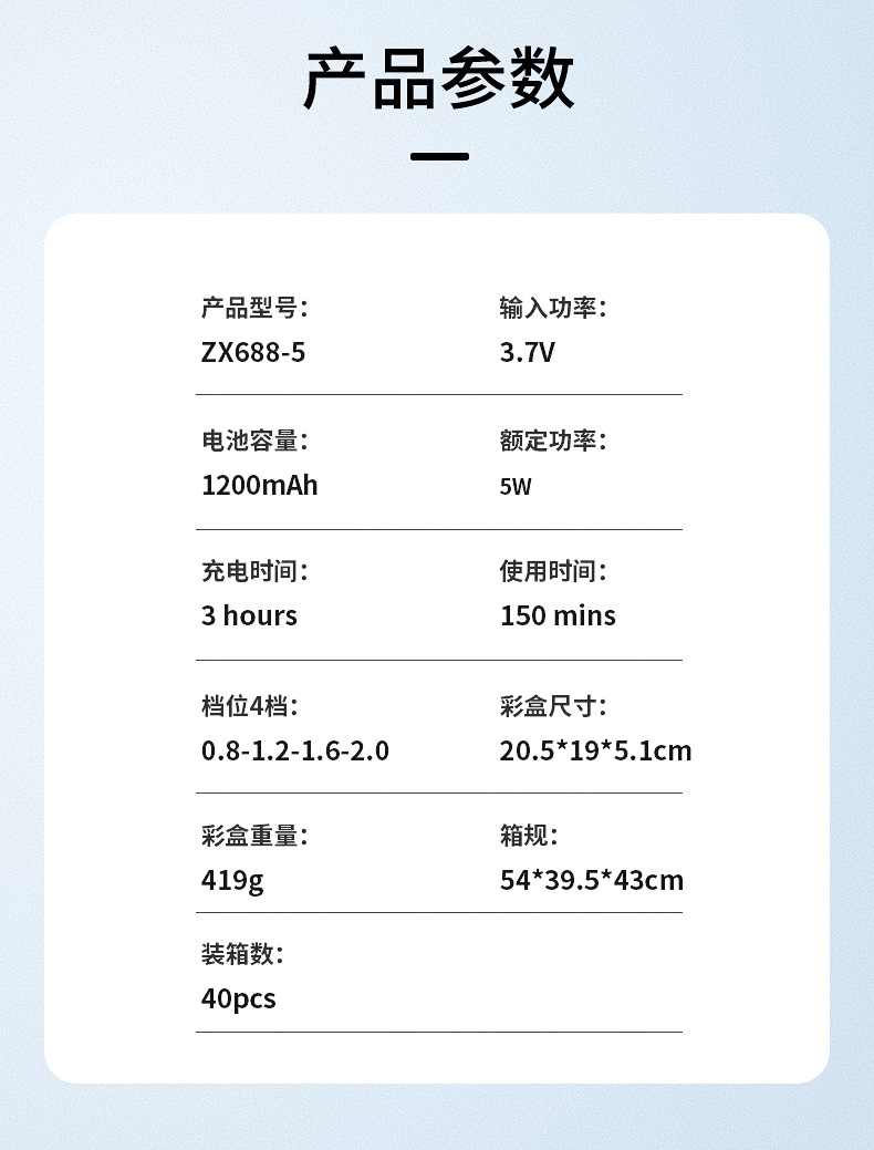 电机功率:5W,100-240V通用电压;USB充电