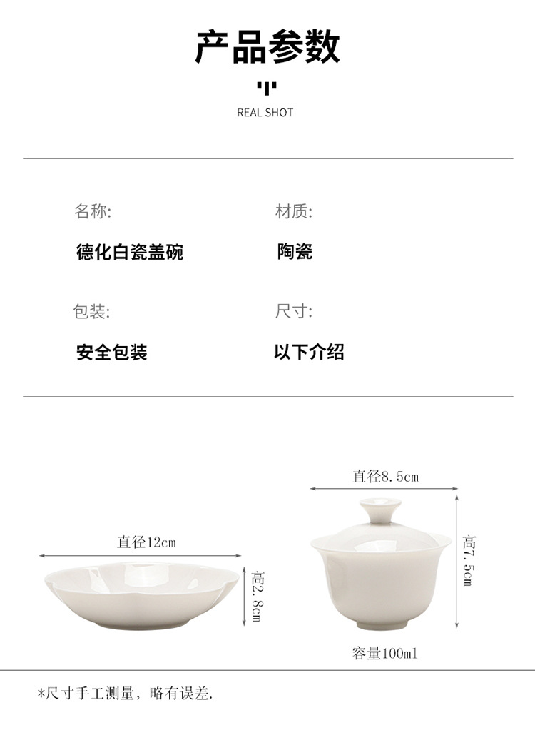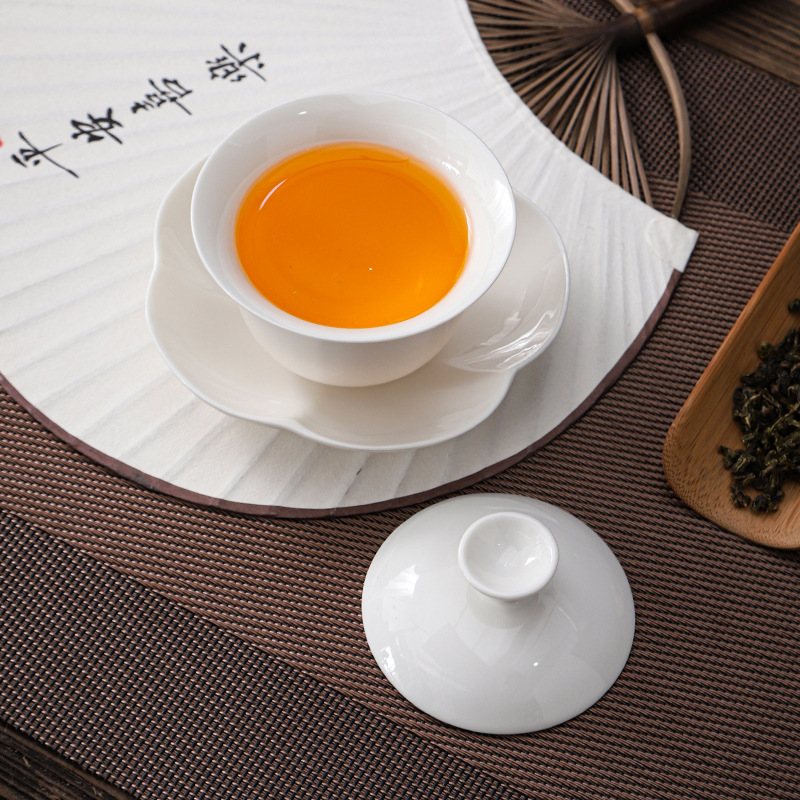 Dehua 양 지방 옥 흰색 도자기 커버 그릇 단일 세라믹 큰 차 그릇 차 그릇 3 피스 커버 그릇은 로고를 사용자 정의 할 수 있습니다