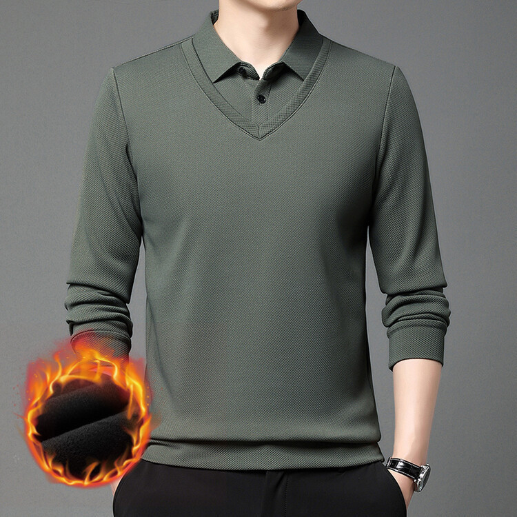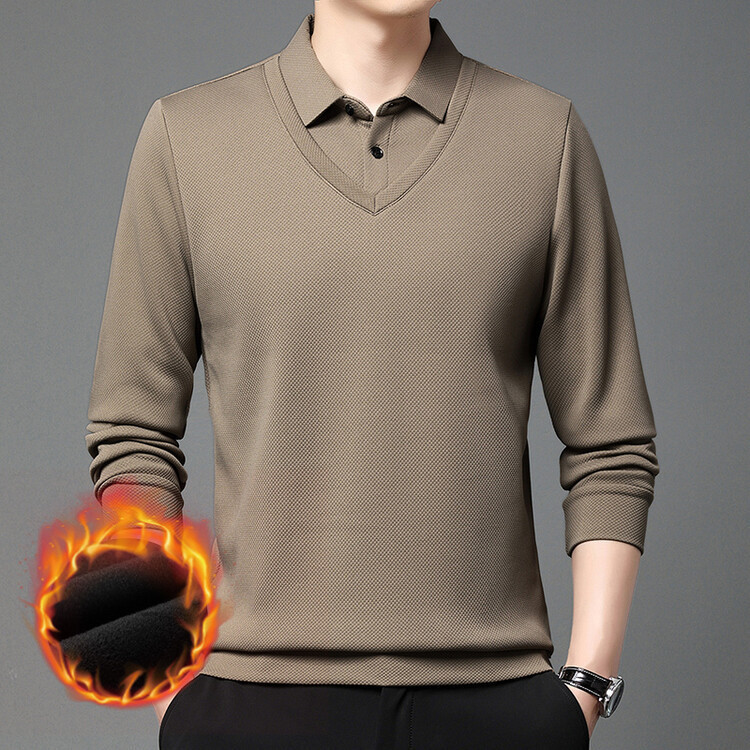 2023秋冬新款男士T恤衫加绒休闲翻领假两件上衣男长袖衫一件代发