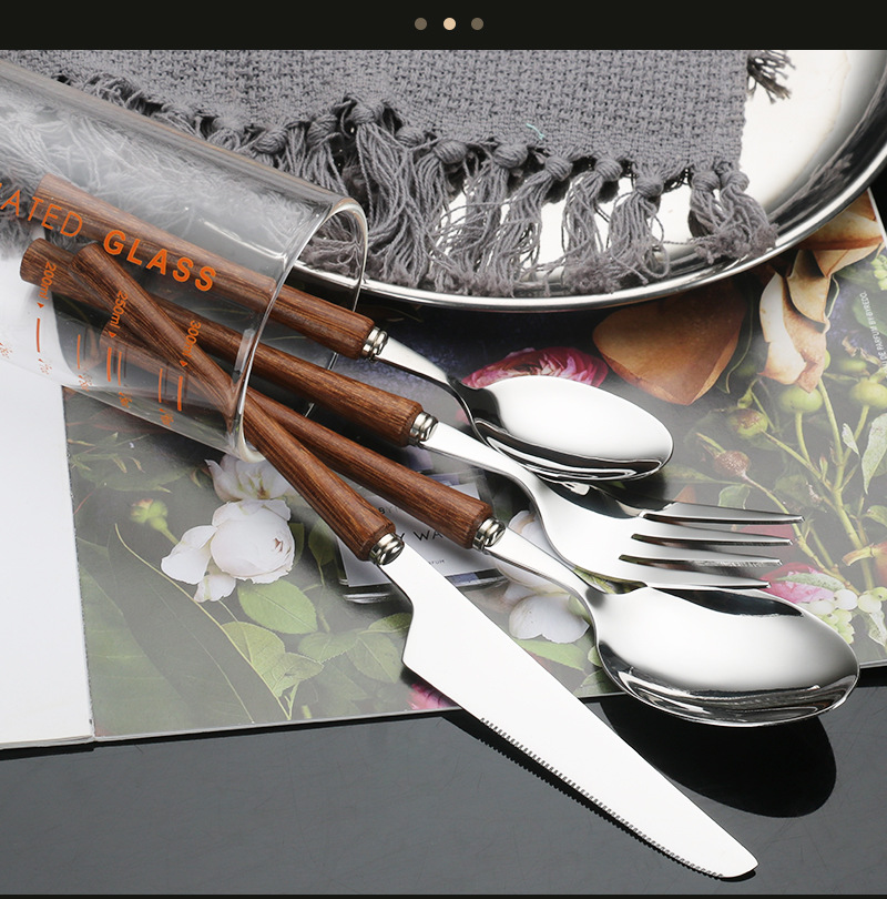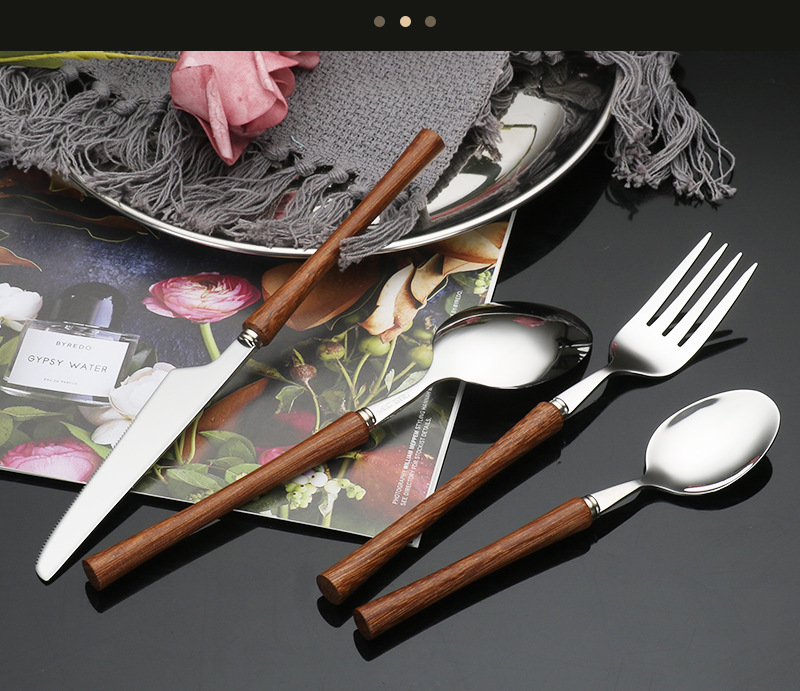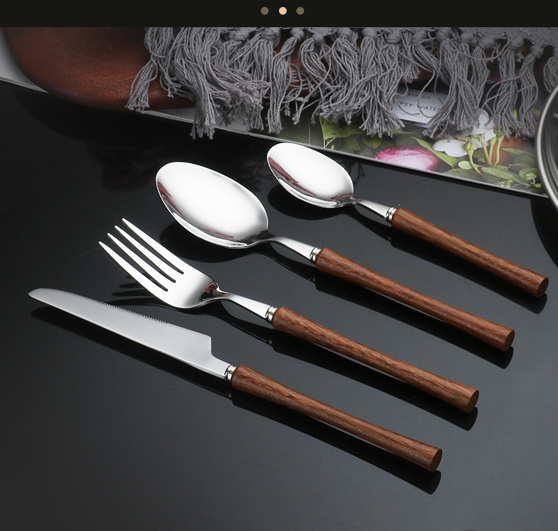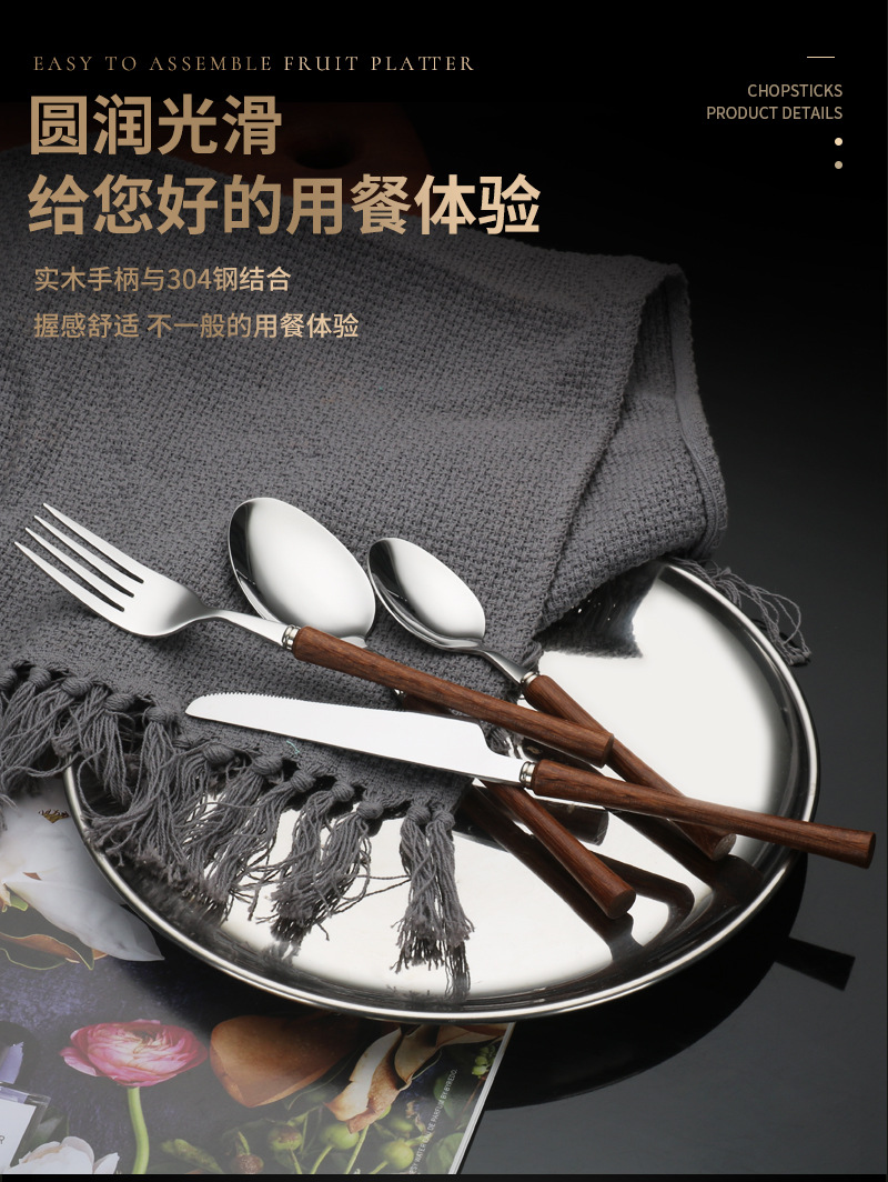 产品介绍:304木柄小蛮腰牛排刀,叉,勺,可以定制激光LOGO