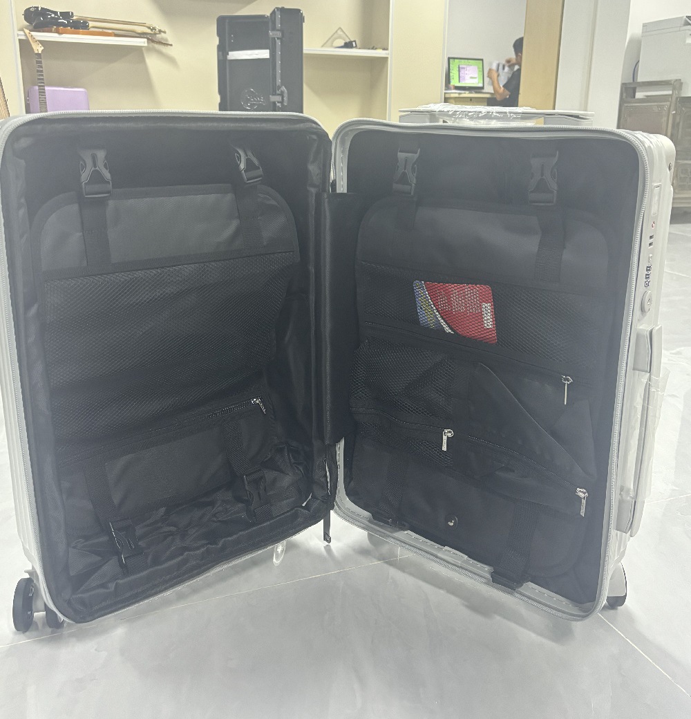 主材磨砂面纯PC,4个金属护角,TSA海关锁带USB充电接口,5cm扩容层,静音万向轮,加厚铝合金拉杆,230D加密里布带可拆卸挂袋和隔层。
