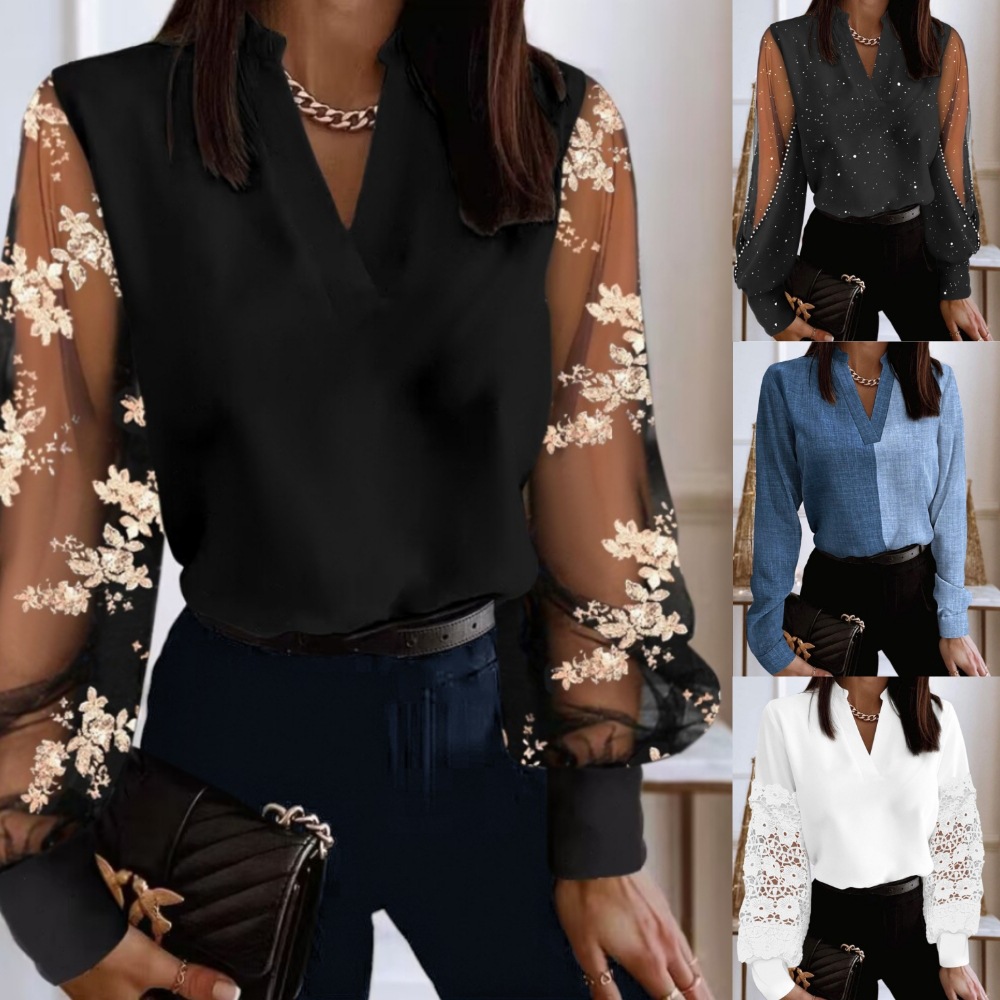 2023 독립 역은 아마존의 인기 가을과 겨울을 기원합니다 새로운 패션 V 넥 레이스 긴 소매 셔츠 여성 의류스토어 가기