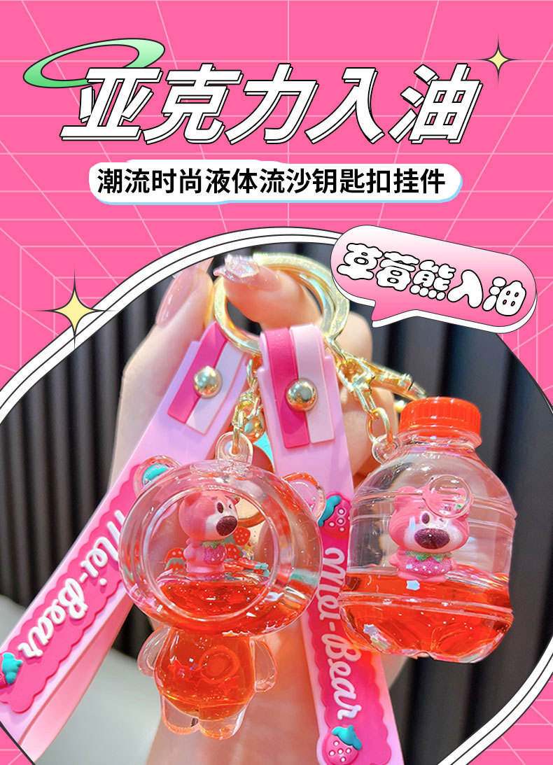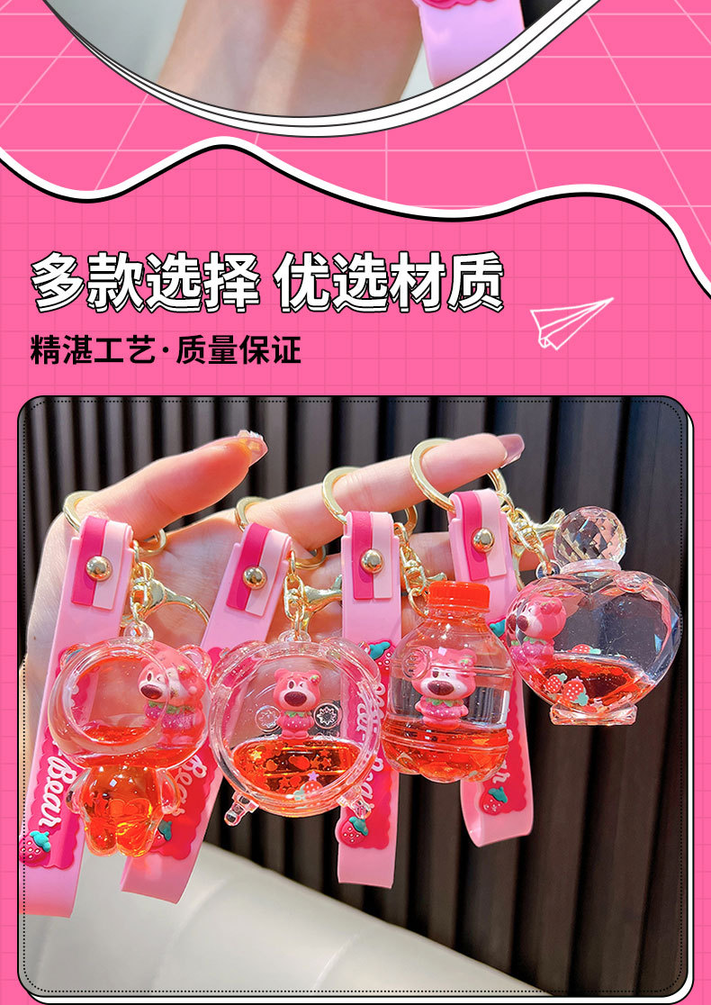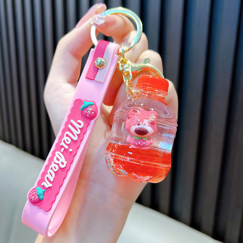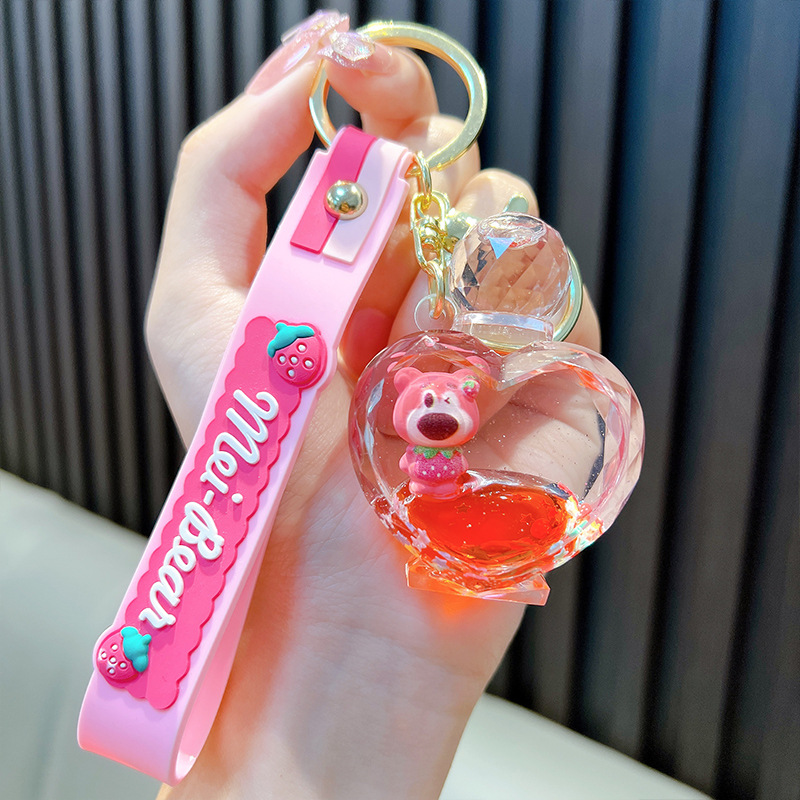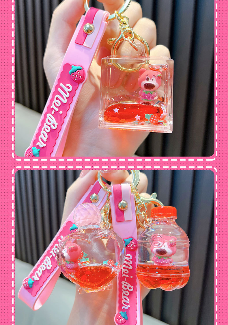 딸기 곰 퀵 샌드 병 키 체인 펜던트 오일 액체 표류 인형 자동차 키 체인 장난감 선물 도매
