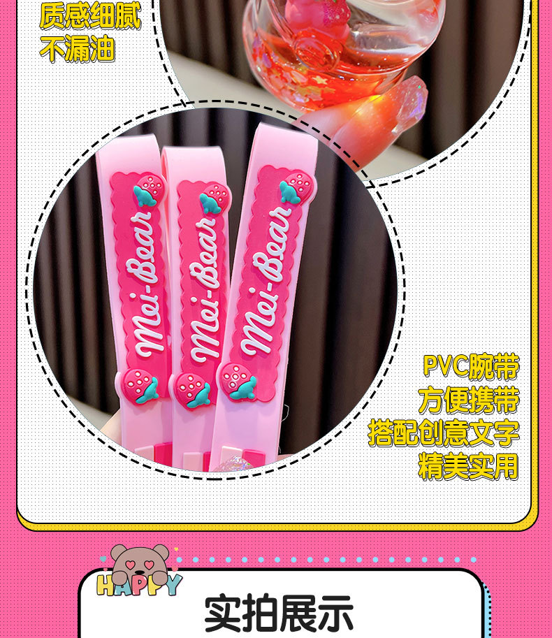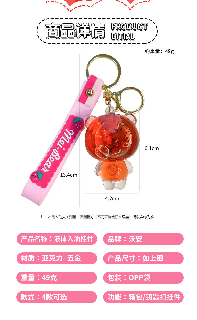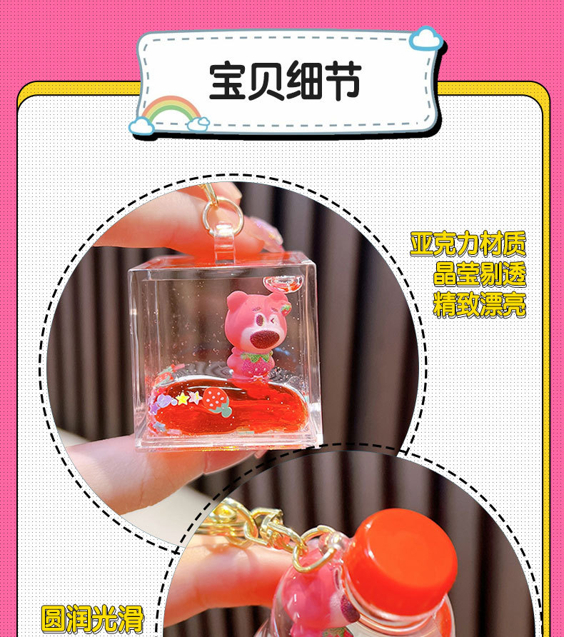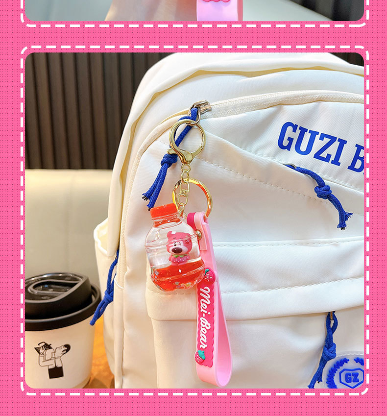 딸기 곰 퀵 샌드 병 키 체인 펜던트 오일 액체 표류 인형 자동차 키 체인 장난감 선물 도매