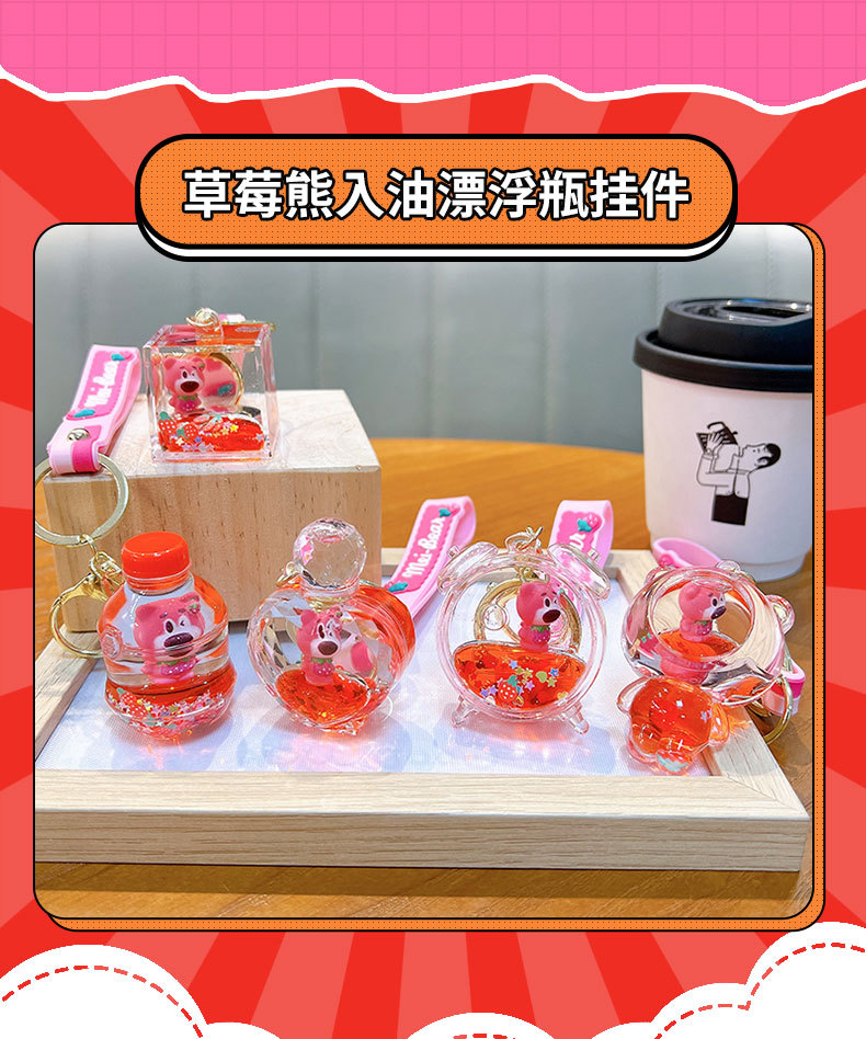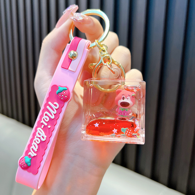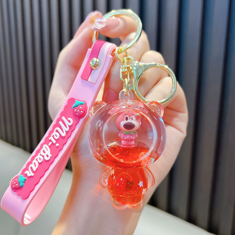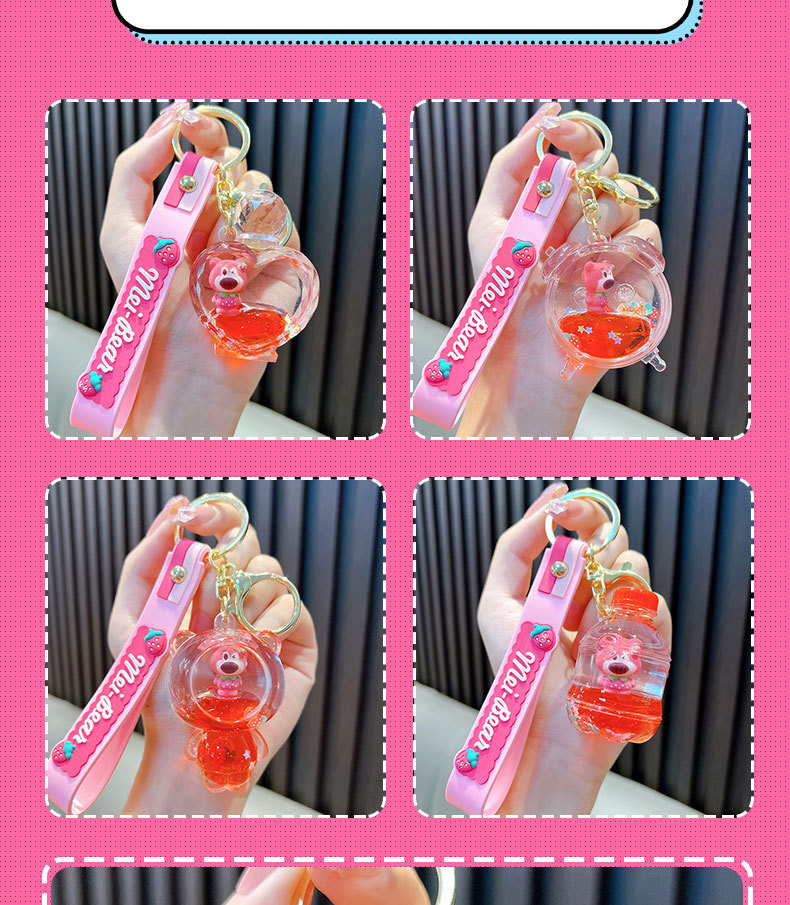딸기 곰 퀵 샌드 병 키 체인 펜던트 오일 액체 표류 인형 자동차 키 체인 장난감 선물 도매스토어 가기