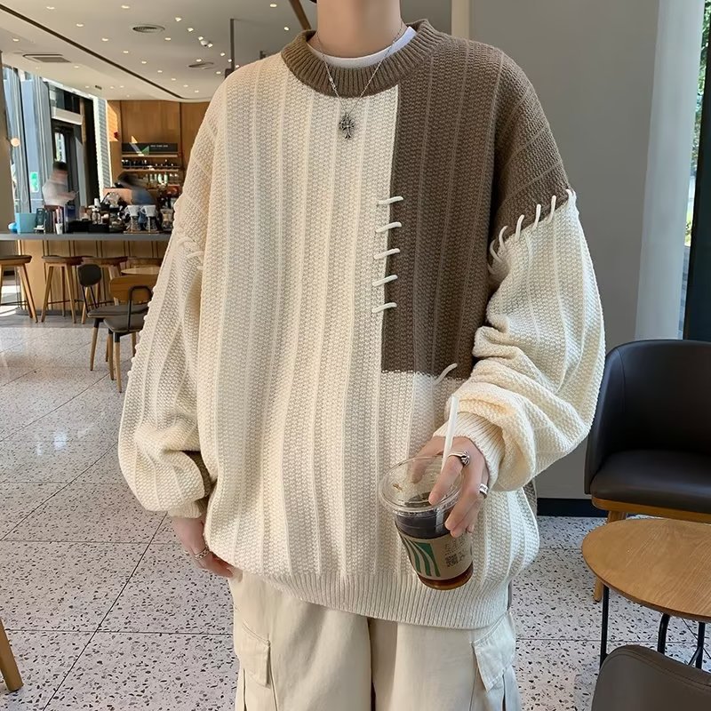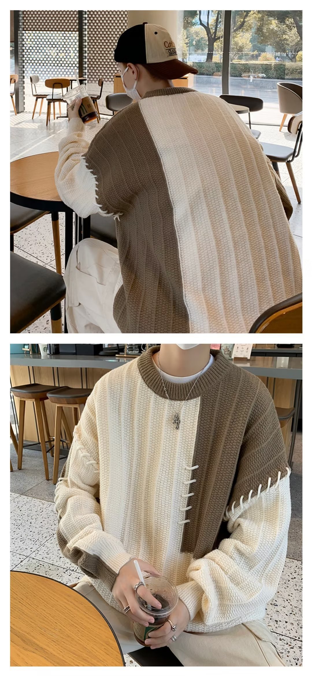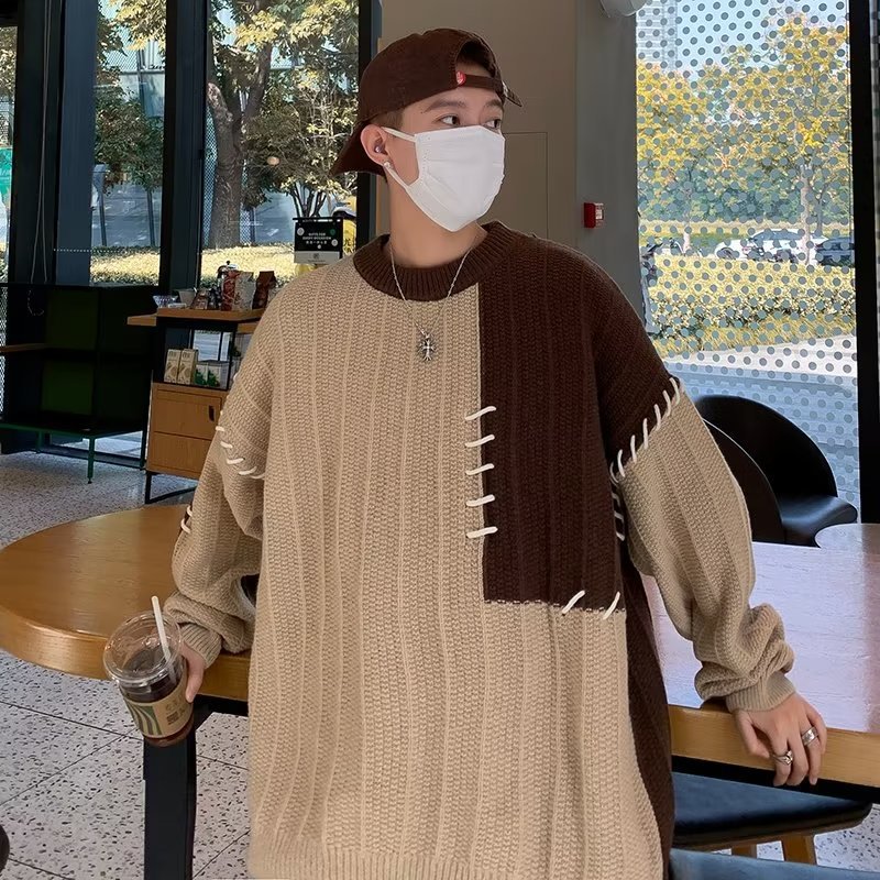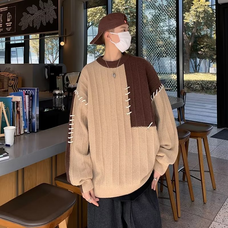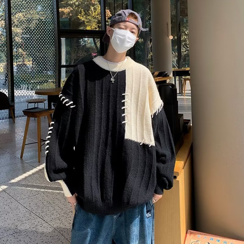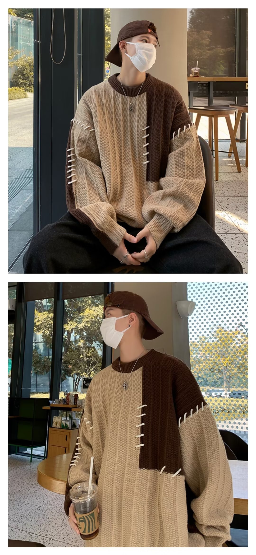 바느질 대비 컬러 스웨터 남성 가을과 겨울 패션 브랜드 느슨한 캐주얼 게으른 스타일 디자인 감각 틈새 풀오버 스웨터