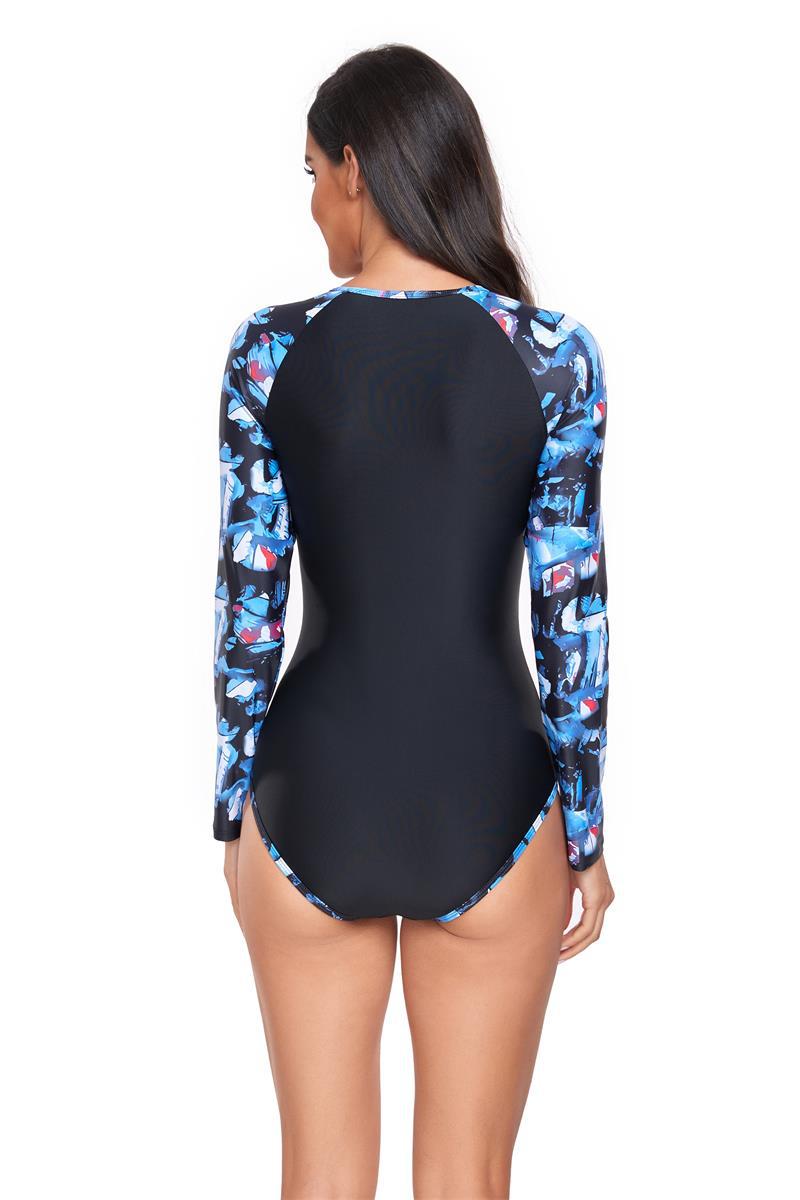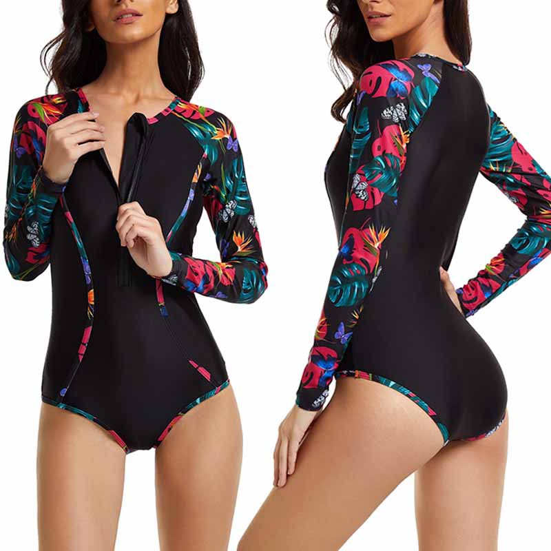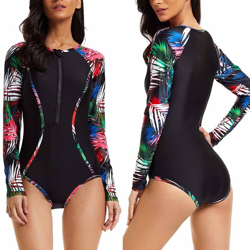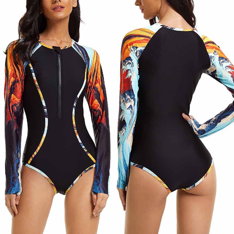 2025 유럽 및 미국 신상 패션 프린트 프린티드 프론트 지퍼 긴팔 여성용 서핑 수영복 (살을 가려주고, 보수적이고, 슬림하게 보이게 하며, 자외선 차단 기능 포함)