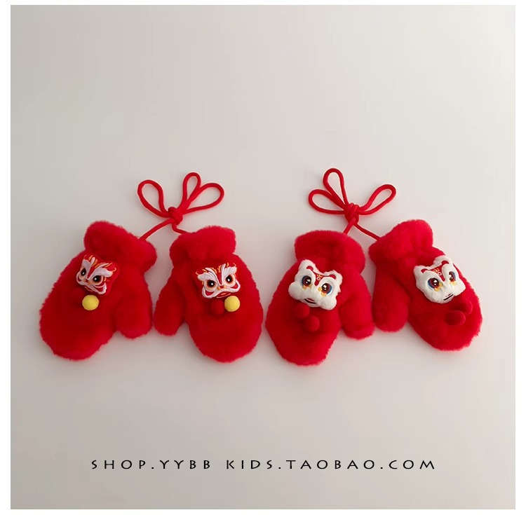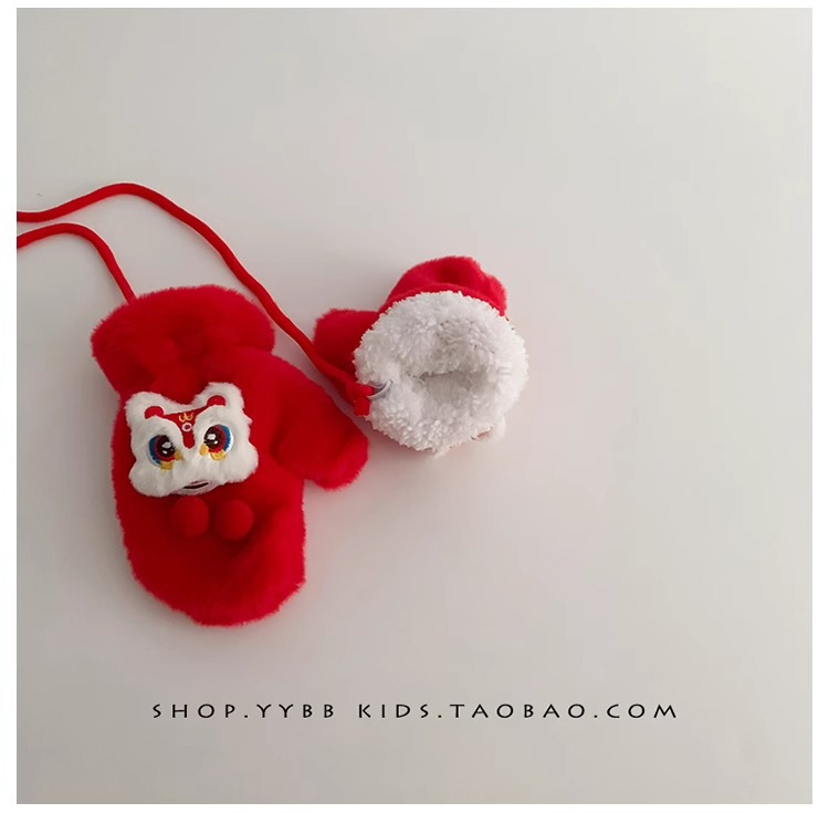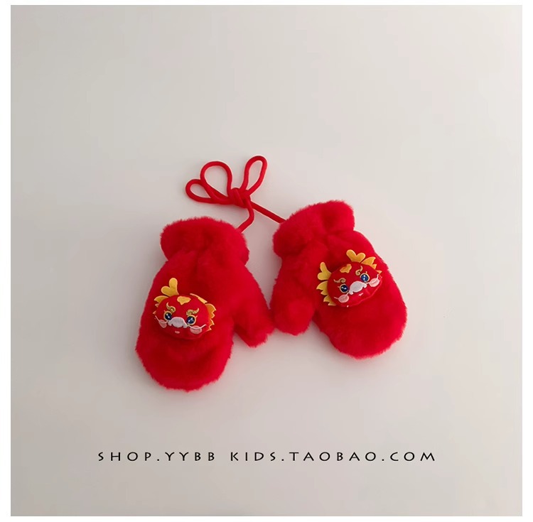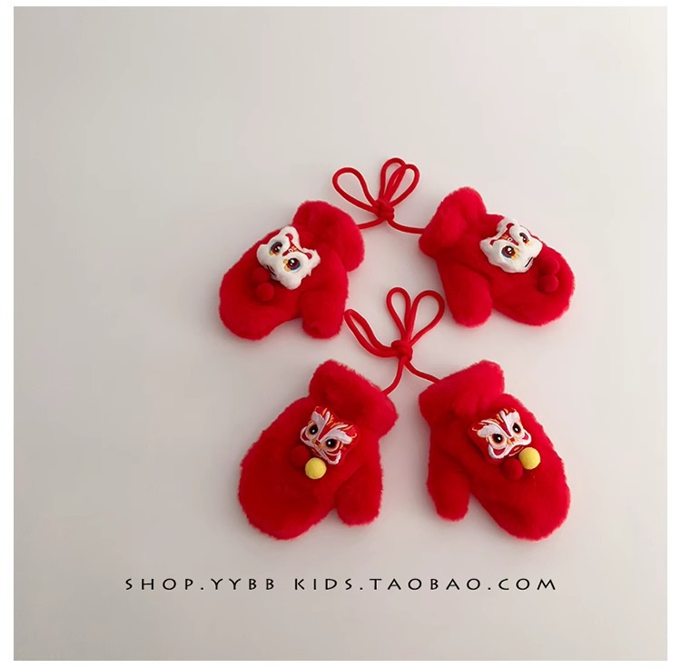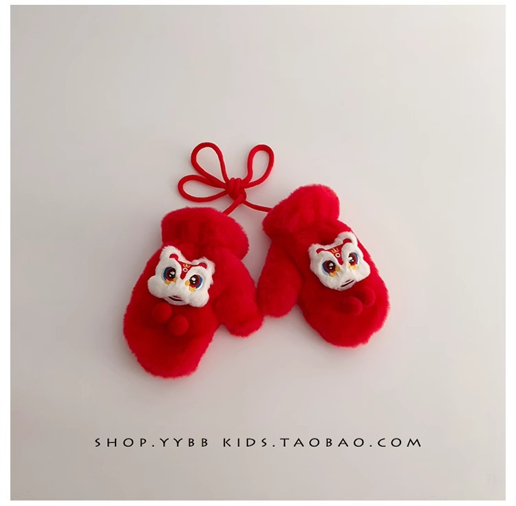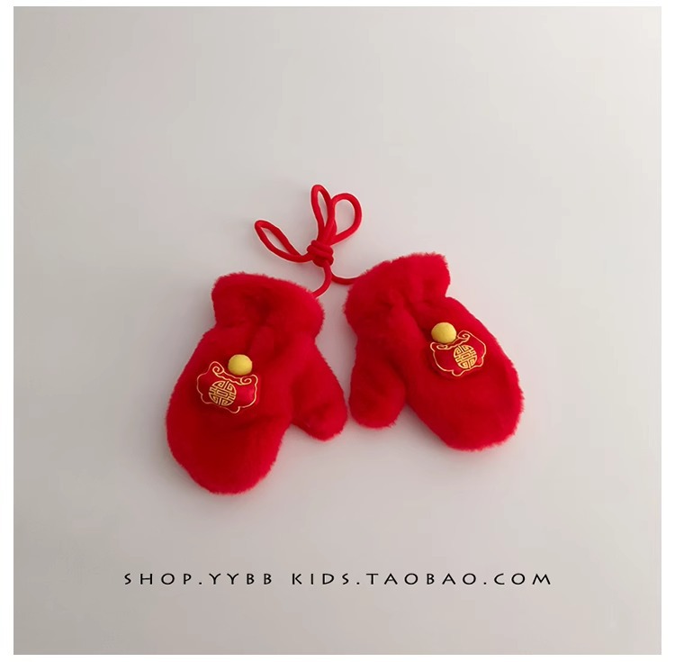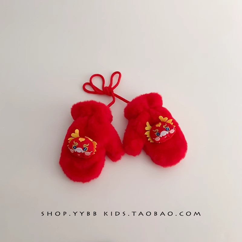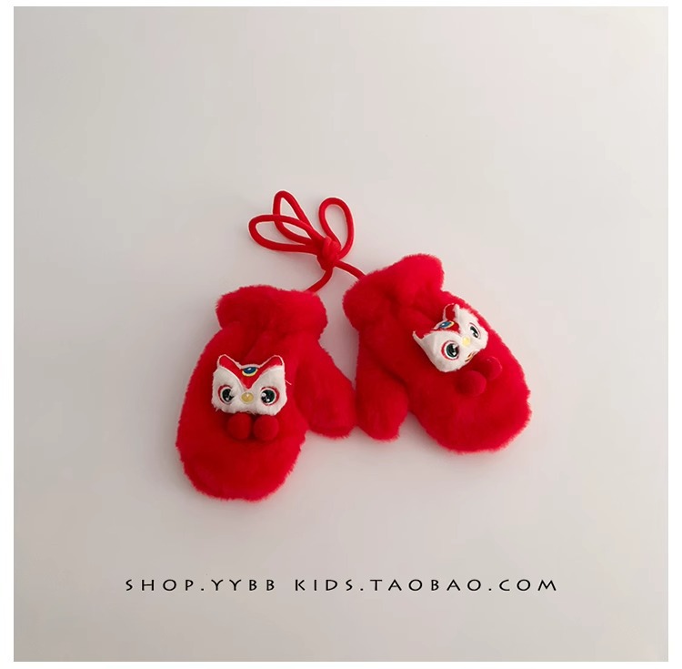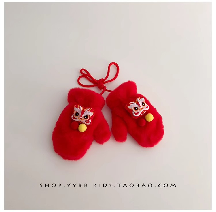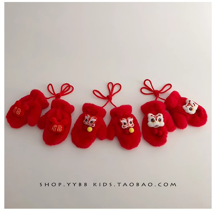 빨간 어린이 장갑 겨울 소년 소녀 아기 Xingshi 새해 축제 따뜻한 기모 어린이 손가락 장갑
