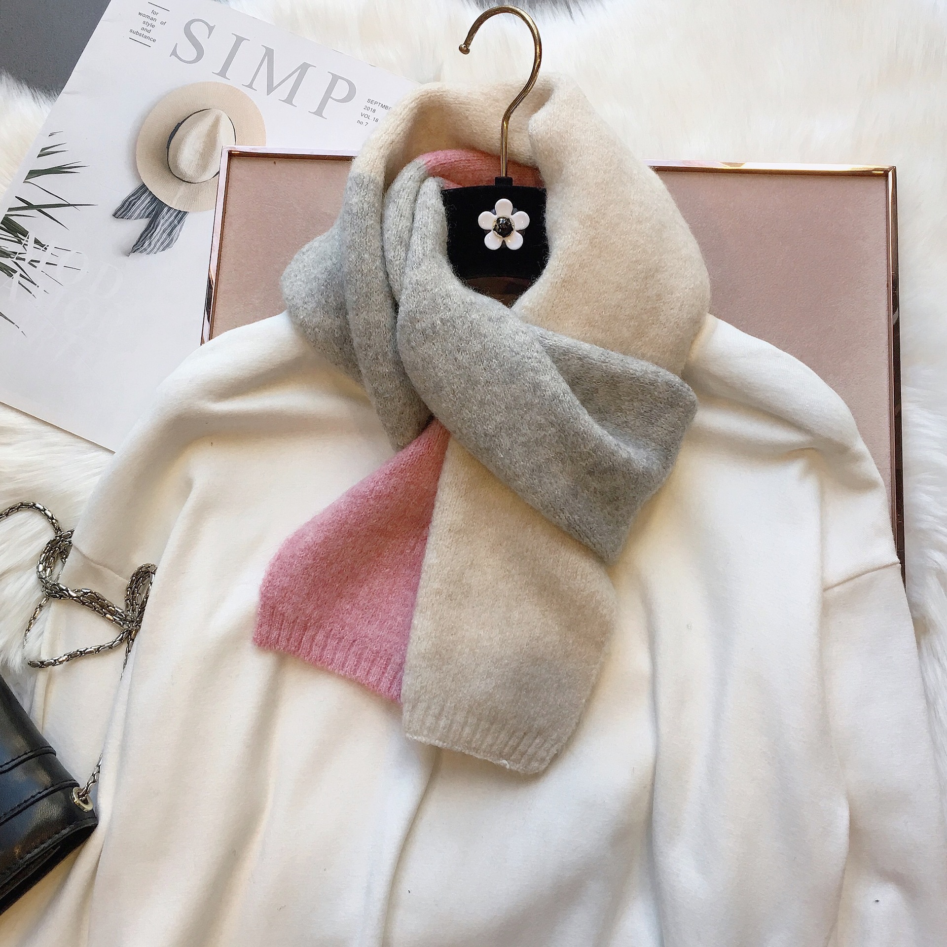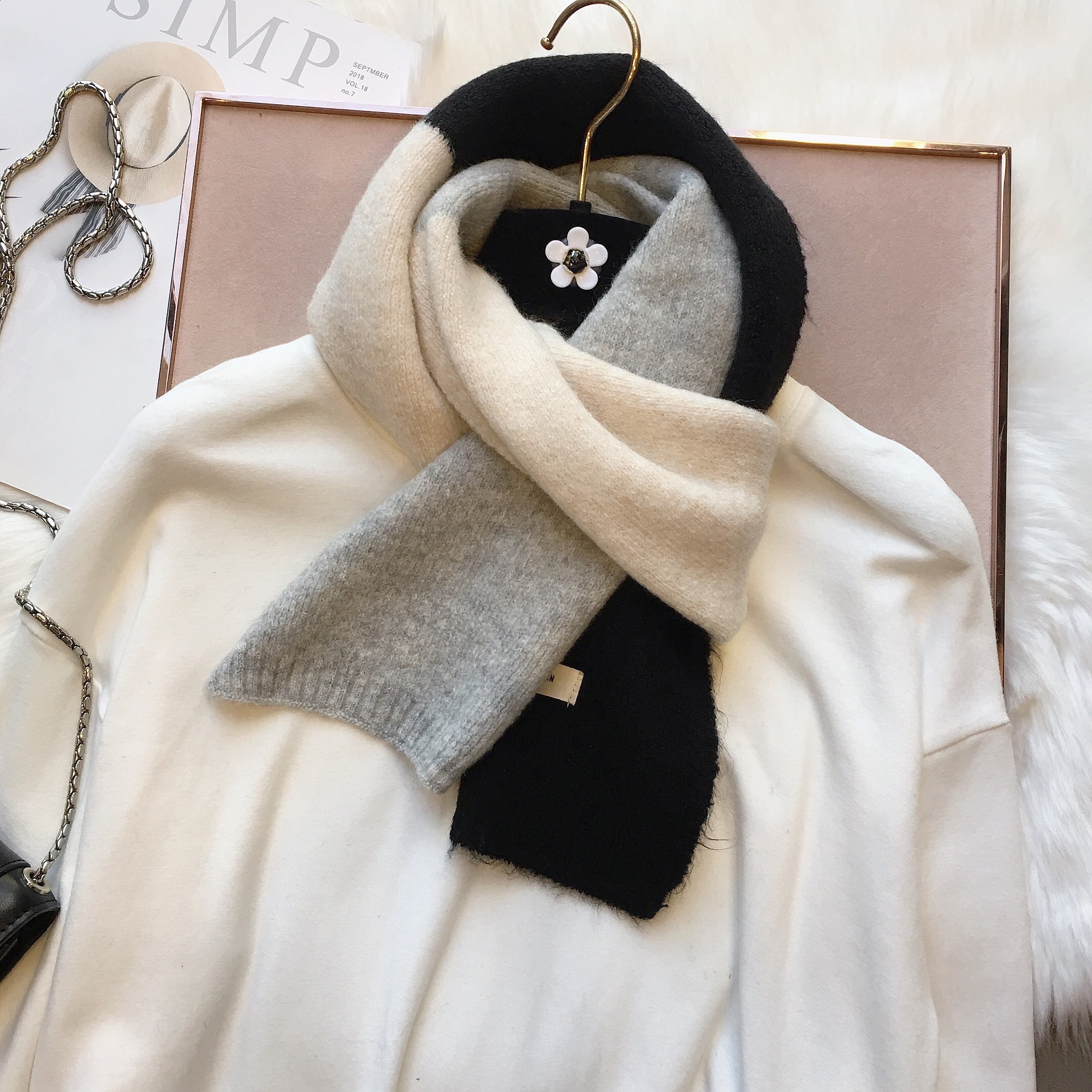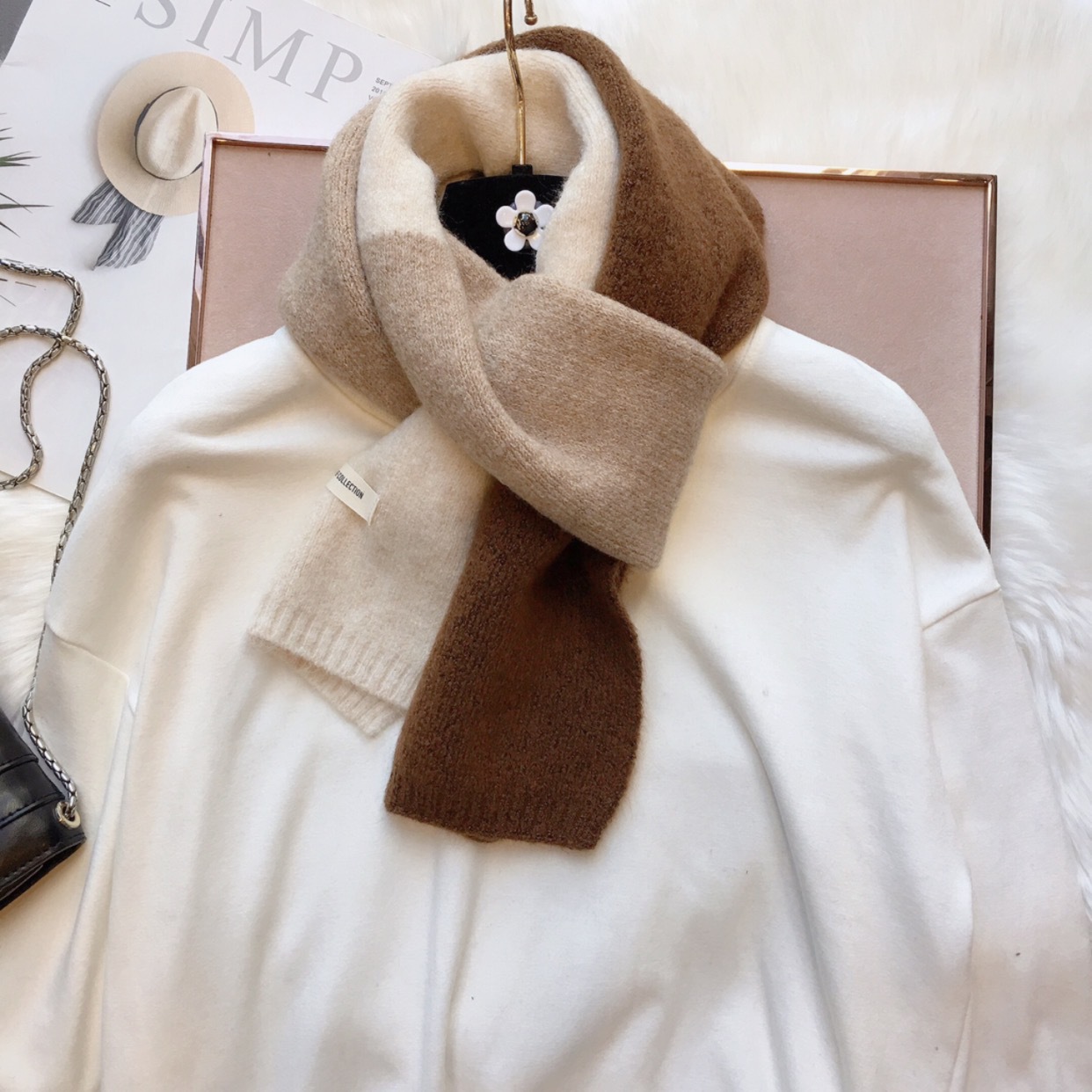 敲温柔~拼色毛线小围巾百搭女韩国窄版保暖围脖学生男女亲子秋冬