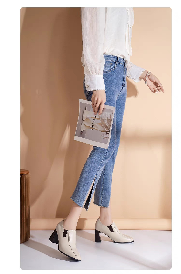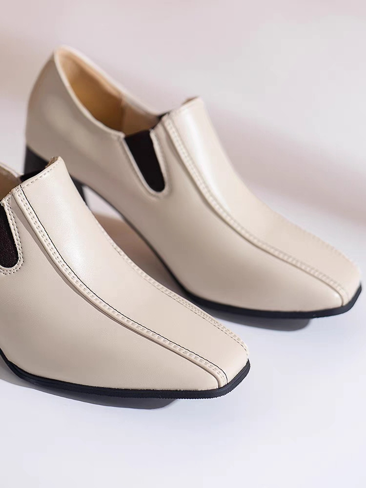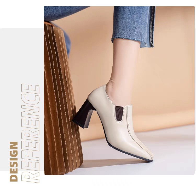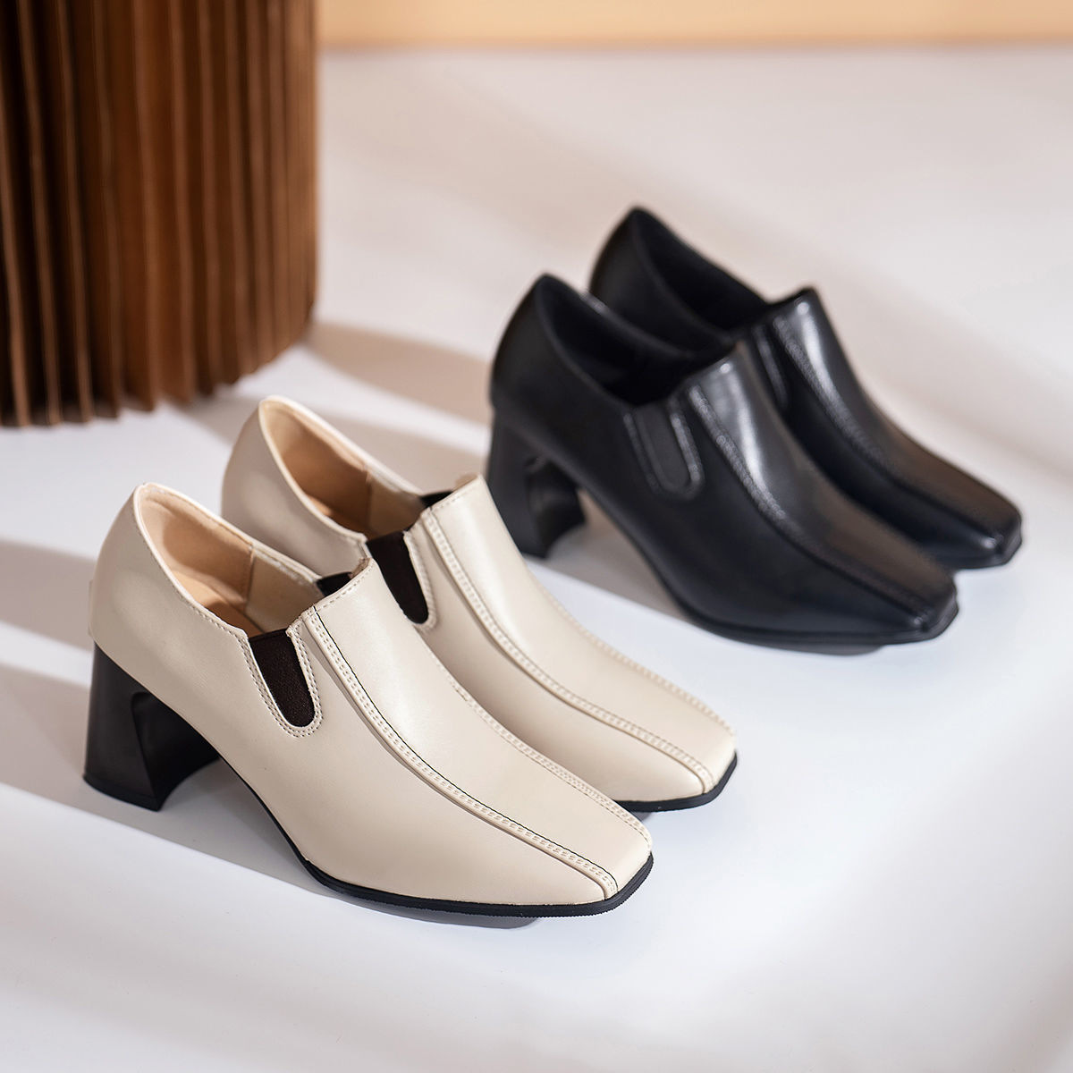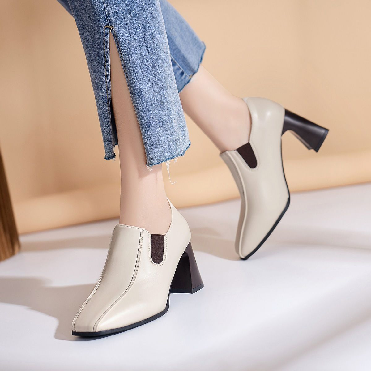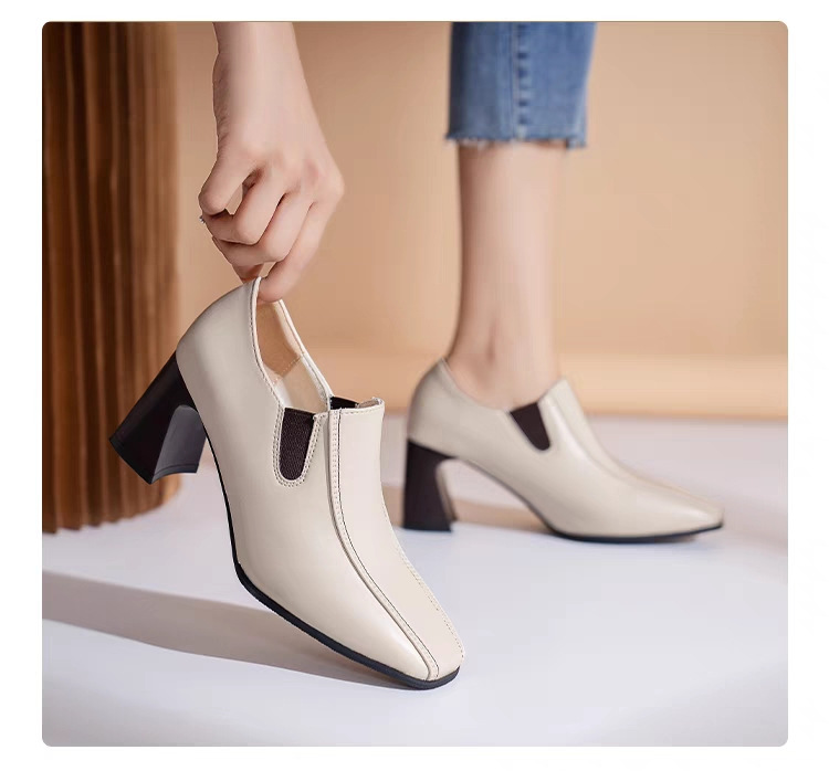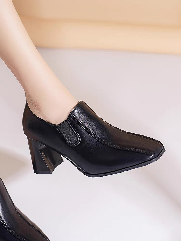 여성용 우아한 청키 힐 싱글 레이어 신발 2024 새로운 영국 스타일 한국식 정사각형 발가락 깊은 입 하이힐 전문 통근 가죽 신발스토어 가기