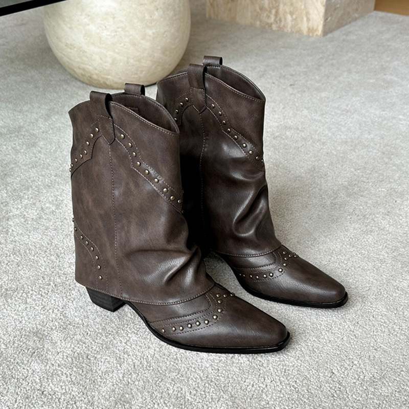 고급 소 가죽 버전 ~ 빈티지 리벳 팬츠 튜브 마틴 부츠 여성용 두꺼운 힐 가죽 뾰족한 송아지 서부 데님 부츠