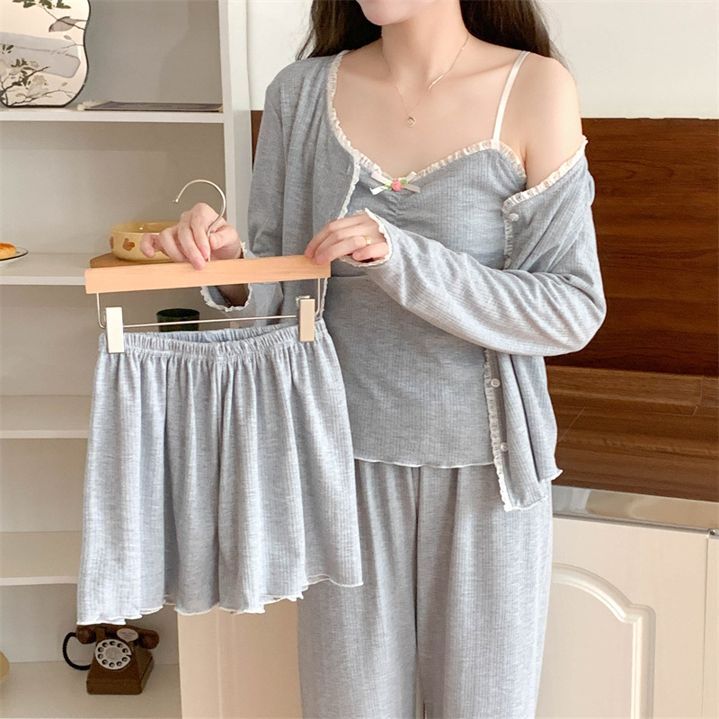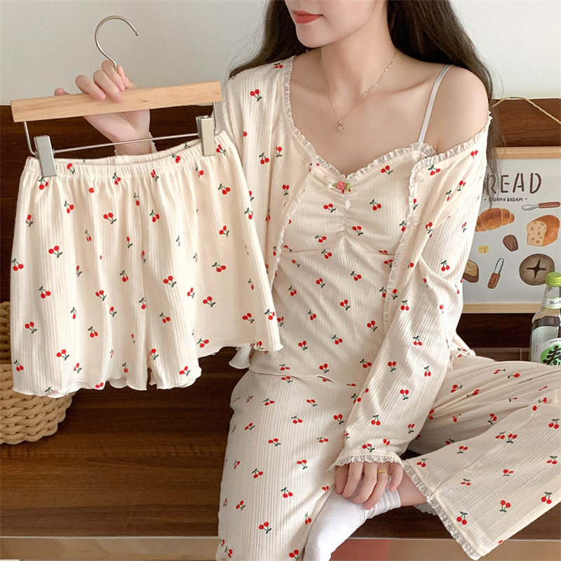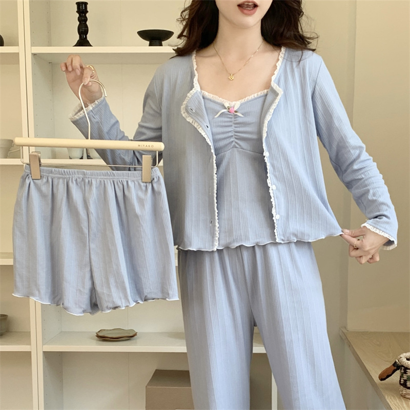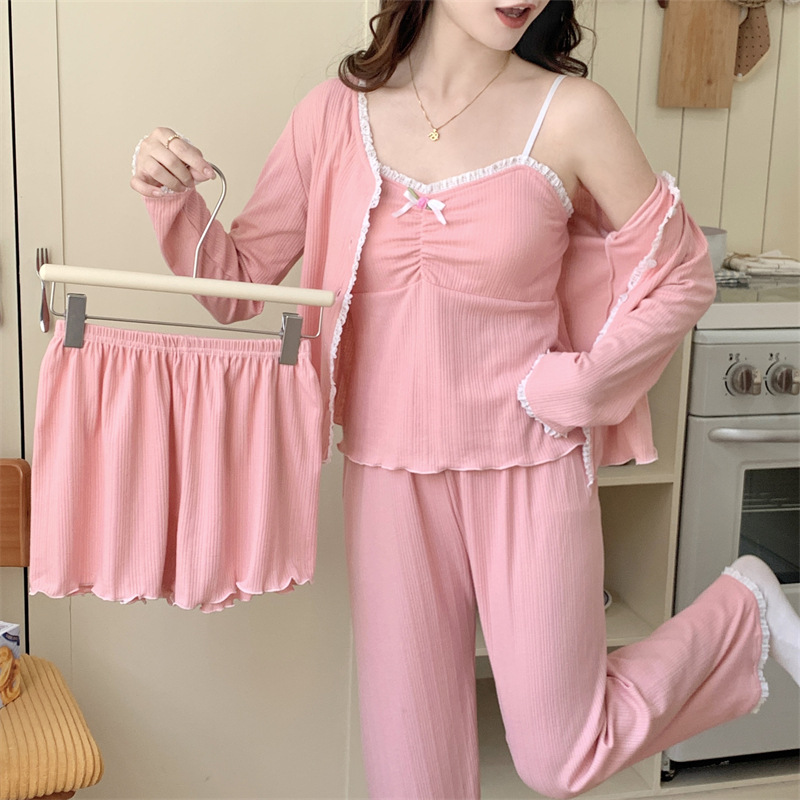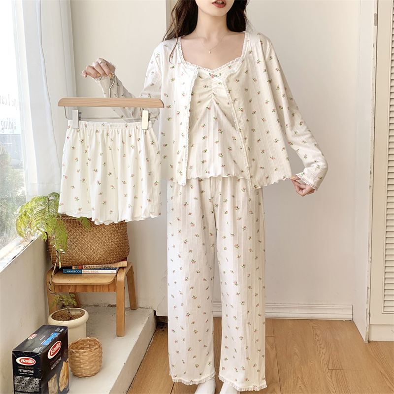 가을과 겨울을위한 가슴 패드가 달린 여성용 코튼 파자마 달콤한 레이스 프린세스 스타일 따뜻한 4 피스 홈 의류스토어 가기