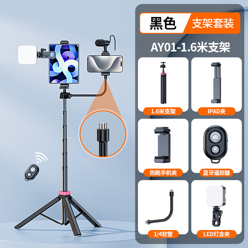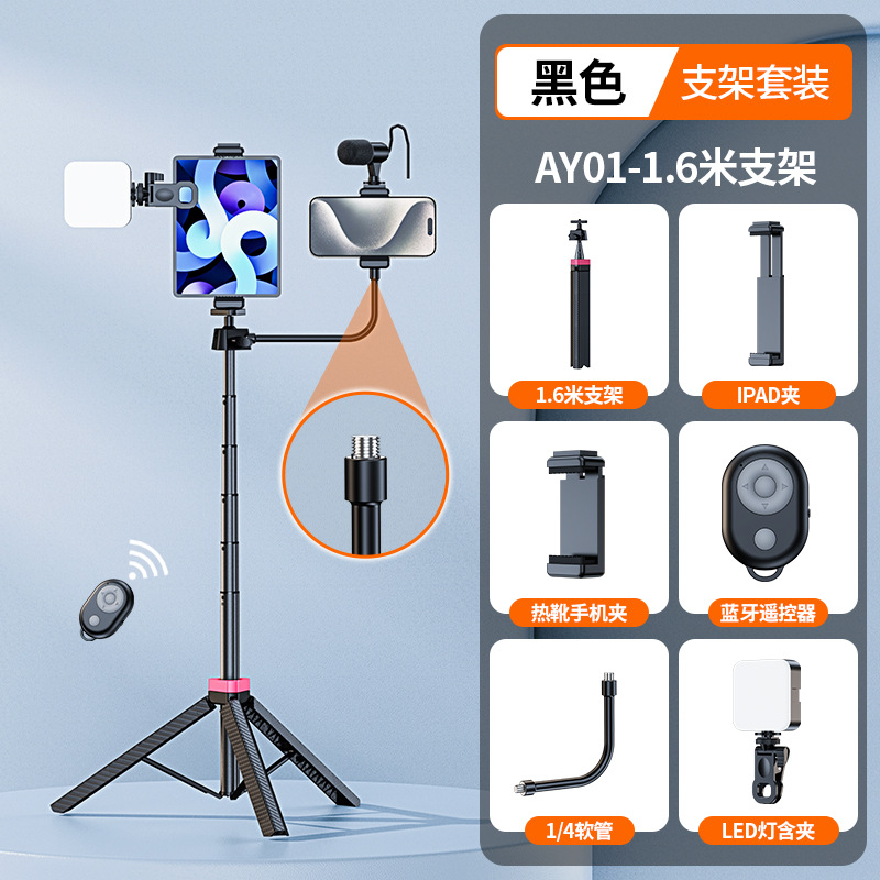 • AY01-1.6m 사진 브래킷 블랙 (표준 핫슈 휴대 전화 클립 + ipad 클립 + 호스 + TikTok 블루투스 + LED 조명)