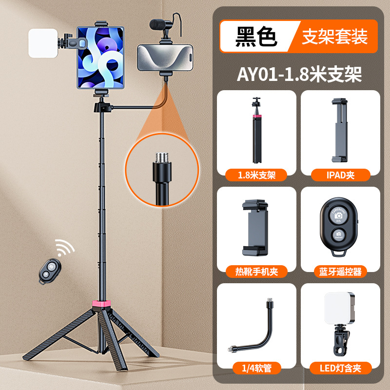 • AY01S-1.8m 사진 브래킷 블랙 (표준 핫슈 휴대 전화 클립 + ipad 클립 + 호스 + TikTok 블루투스 + RGB 라이트)