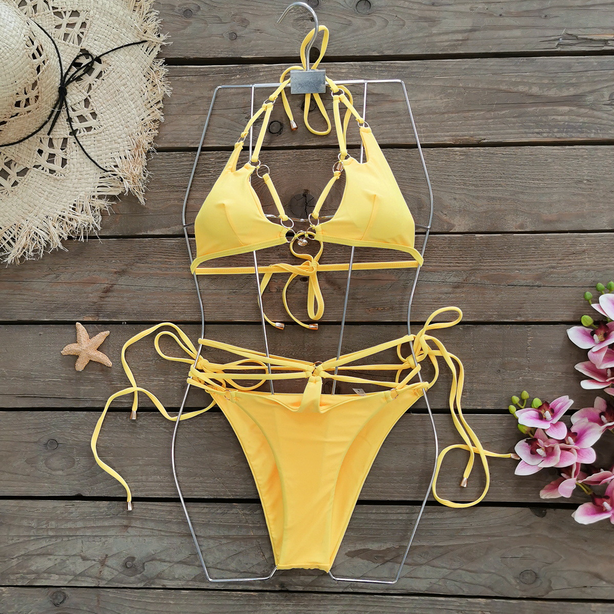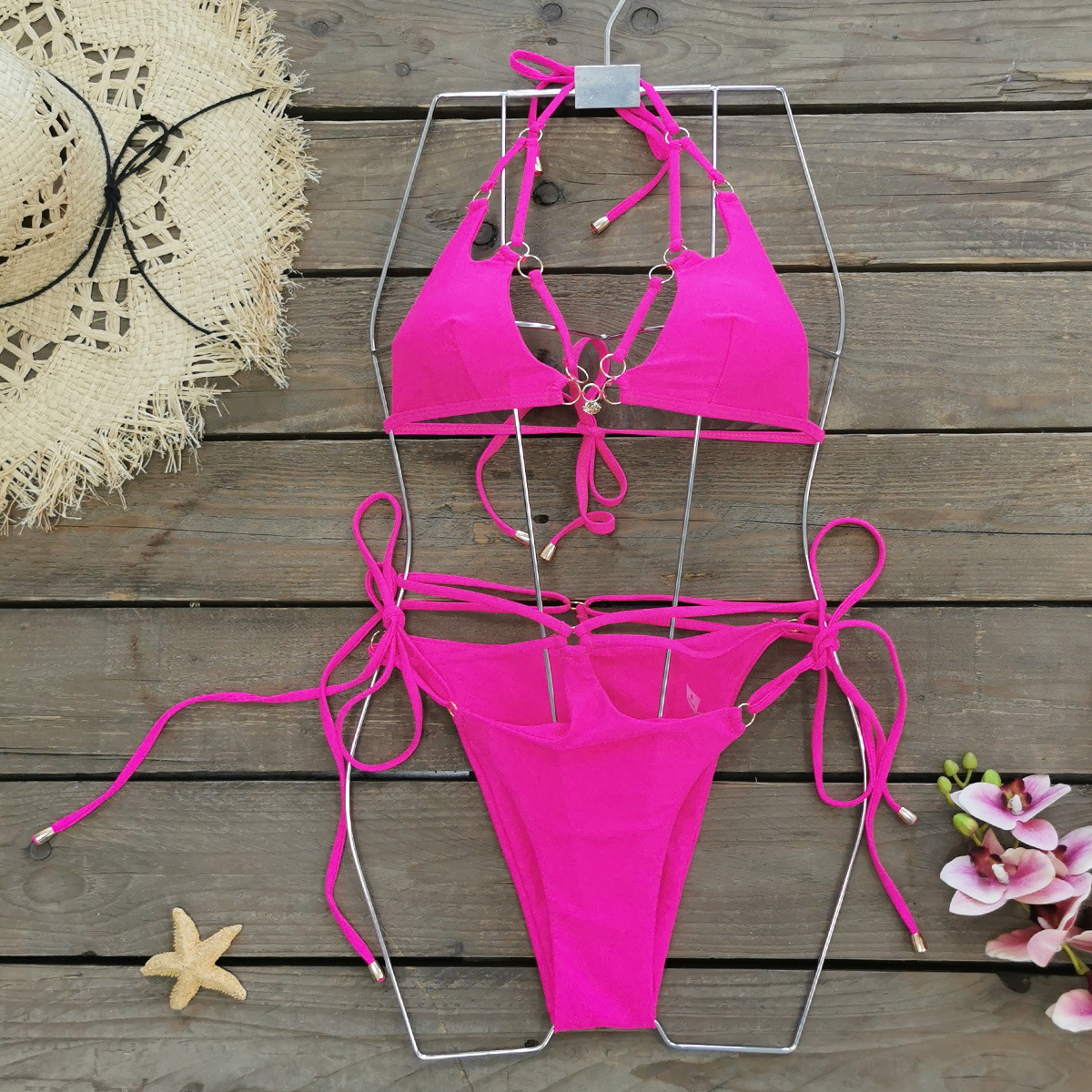 3 점 단색 비키니 2024 새로운 스플릿 수영복 여성 레이스 업 국경 간 대외 무역 섹시한 유럽과 미국 비키니