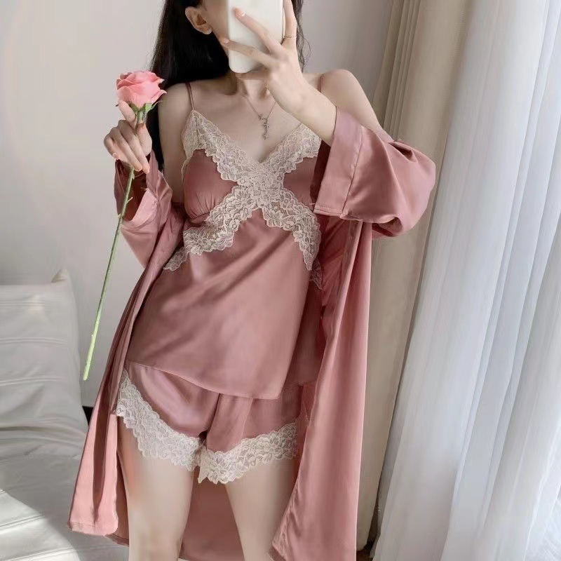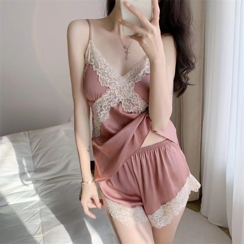 여름용 아이스 실크 슬립웨어 여성용 레이스 트림 백리스 인터넷 스타일 가슴 패드 포함 홈웨어