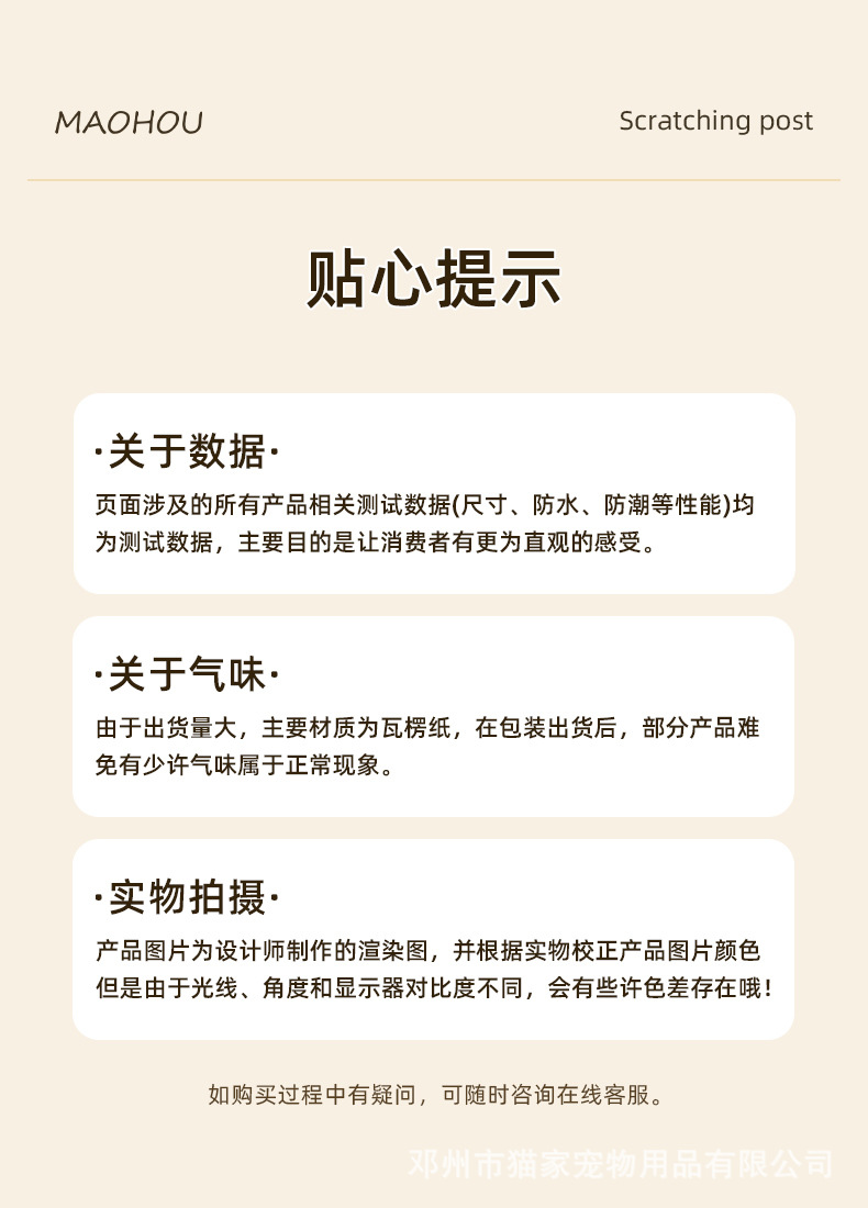 因猫抓板是批发价格,不接受非质量问题的退货,因买家拒收或无人签收导致退回的,或个人原因不想要了等非质量原因退货退款的,一律不接受退货退款。如特殊原因一定要退货的联系商家协商同意后请买家按以下运费标准补偿商家运费,运费补偿5元/件,及赔偿商家产品价值的一切费用。下单即表示同意此规则,会以此为证据向平台投诉或申诉,望广大消费者谅解.