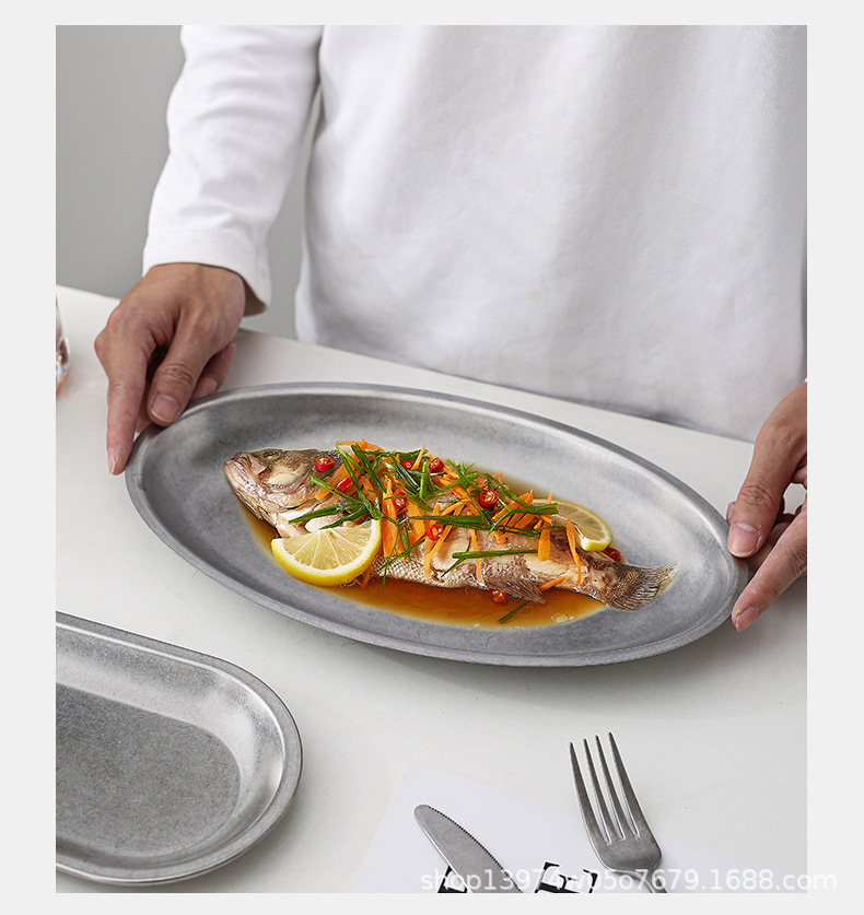 ins风盘子复古做旧304不锈钢方形椭圆分格牛排意面甜品盘叉勺批发