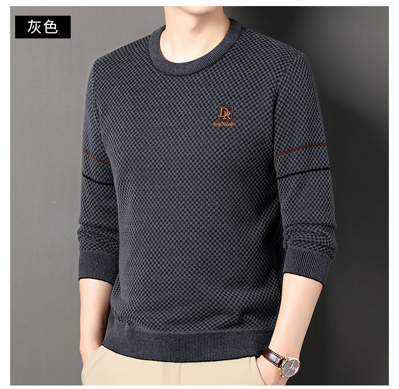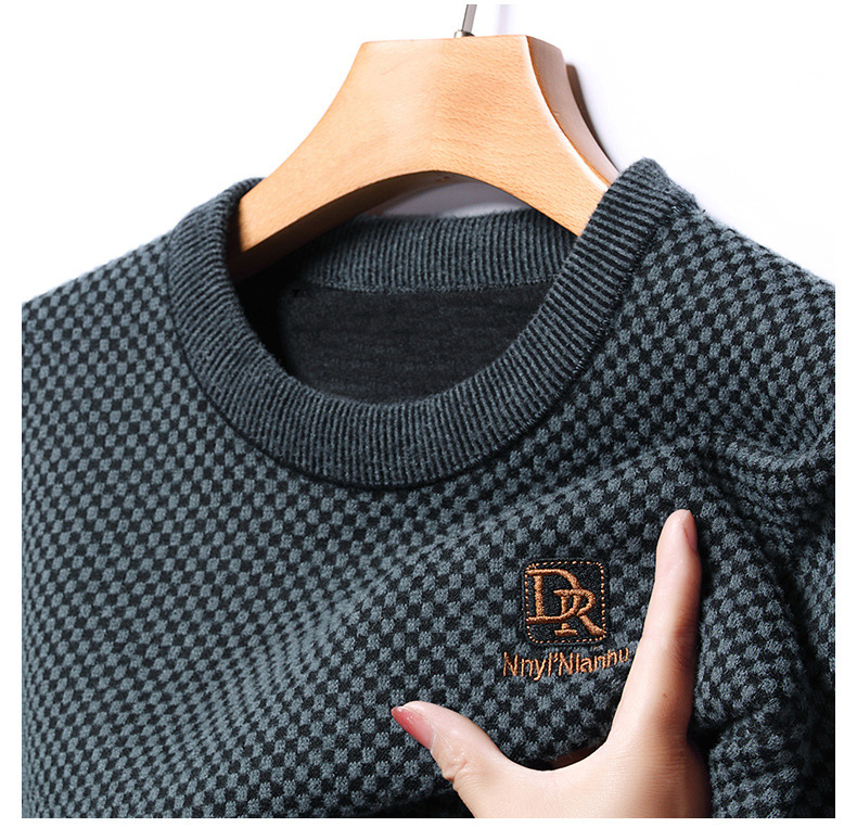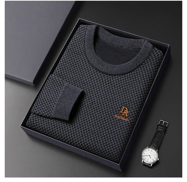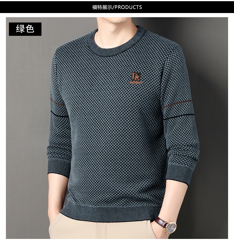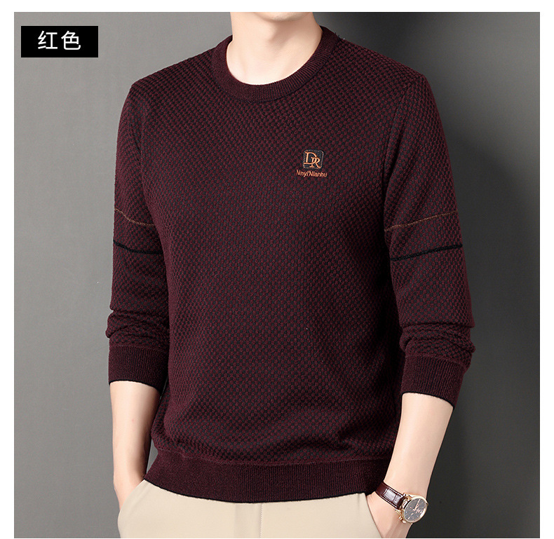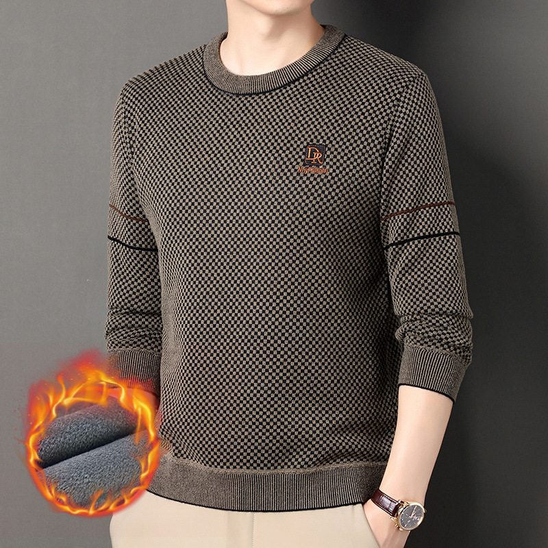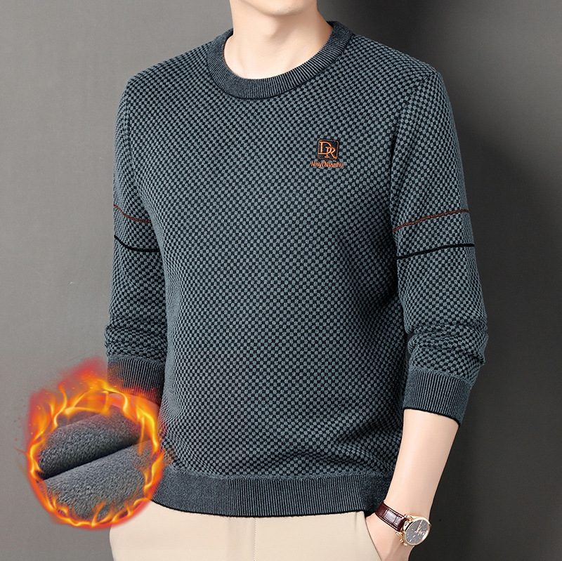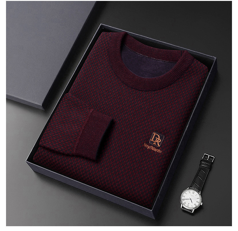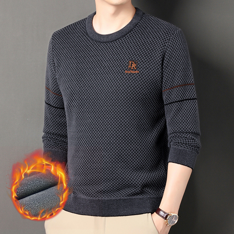 남성용 새 스웨터 기모 양각 된 가을과 겨울 긴 소매 둥근 목 니트 중년 및 노인 남성 자카드 컬러 매칭 올 매칭