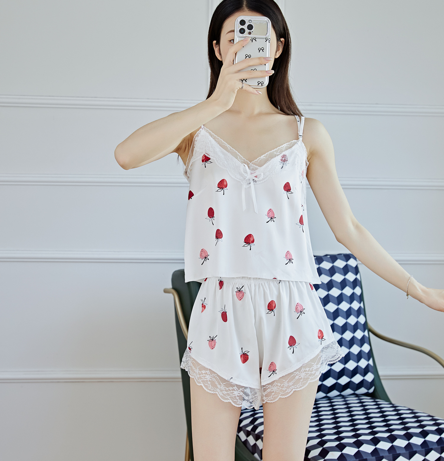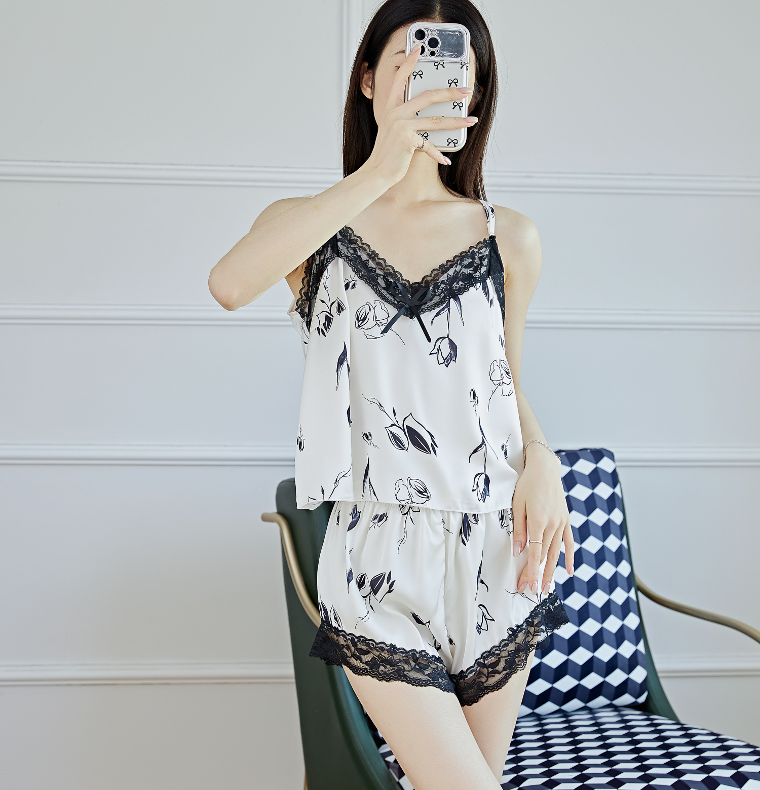 여름 잠옷 여성용 아이스 실크 섹시한 서스펜더 반바지 2 피스 달콤한 레이스 인쇄 레오파드 무늬 얇은 홈웨어