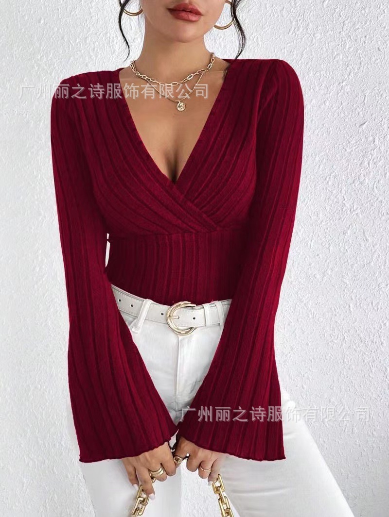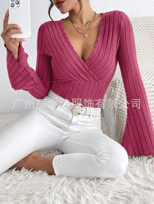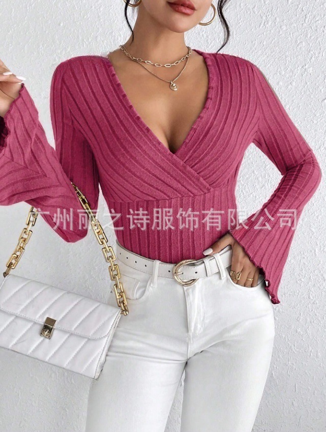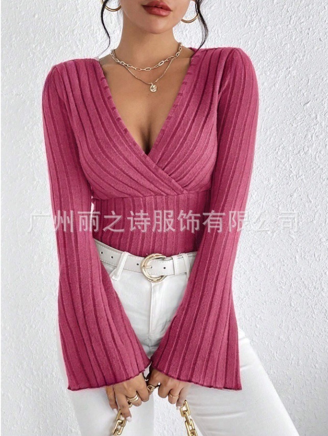 2024년 유럽 및 미국 아마존 여성 의류 가을 겨울 신상품 기본 레이어드 셔츠 골지 브이넥 슬림핏 긴팔 여성 티셔츠