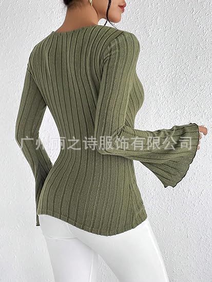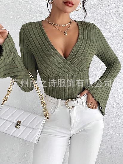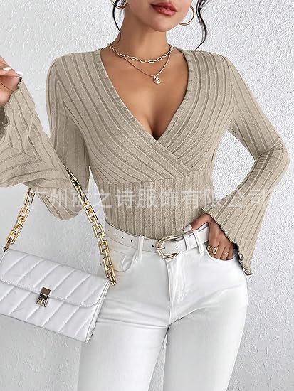 2024년 유럽 및 미국 아마존 여성 의류 가을 겨울 신상품 기본 레이어드 셔츠 골지 브이넥 슬림핏 긴팔 여성 티셔츠스토어 가기