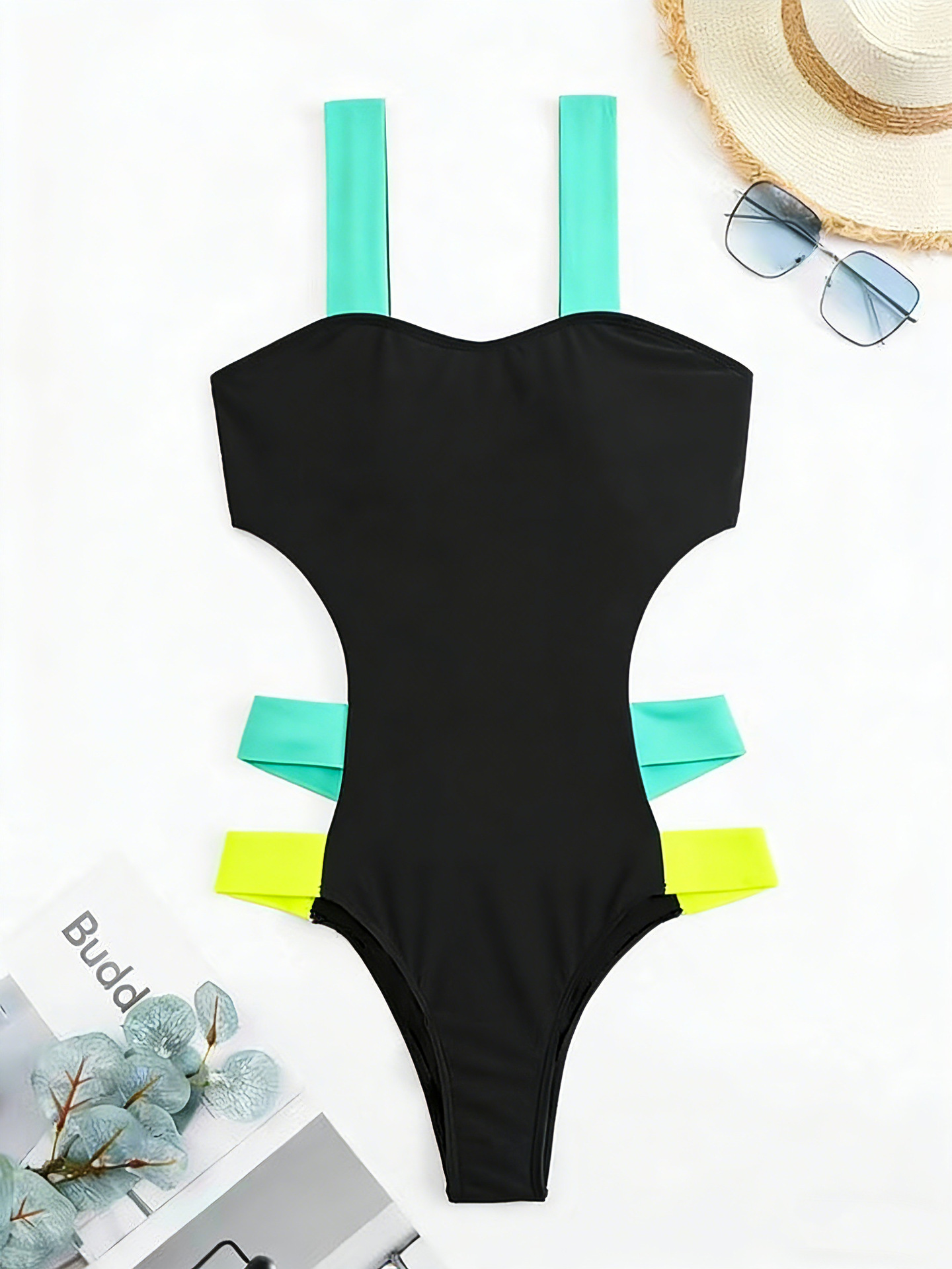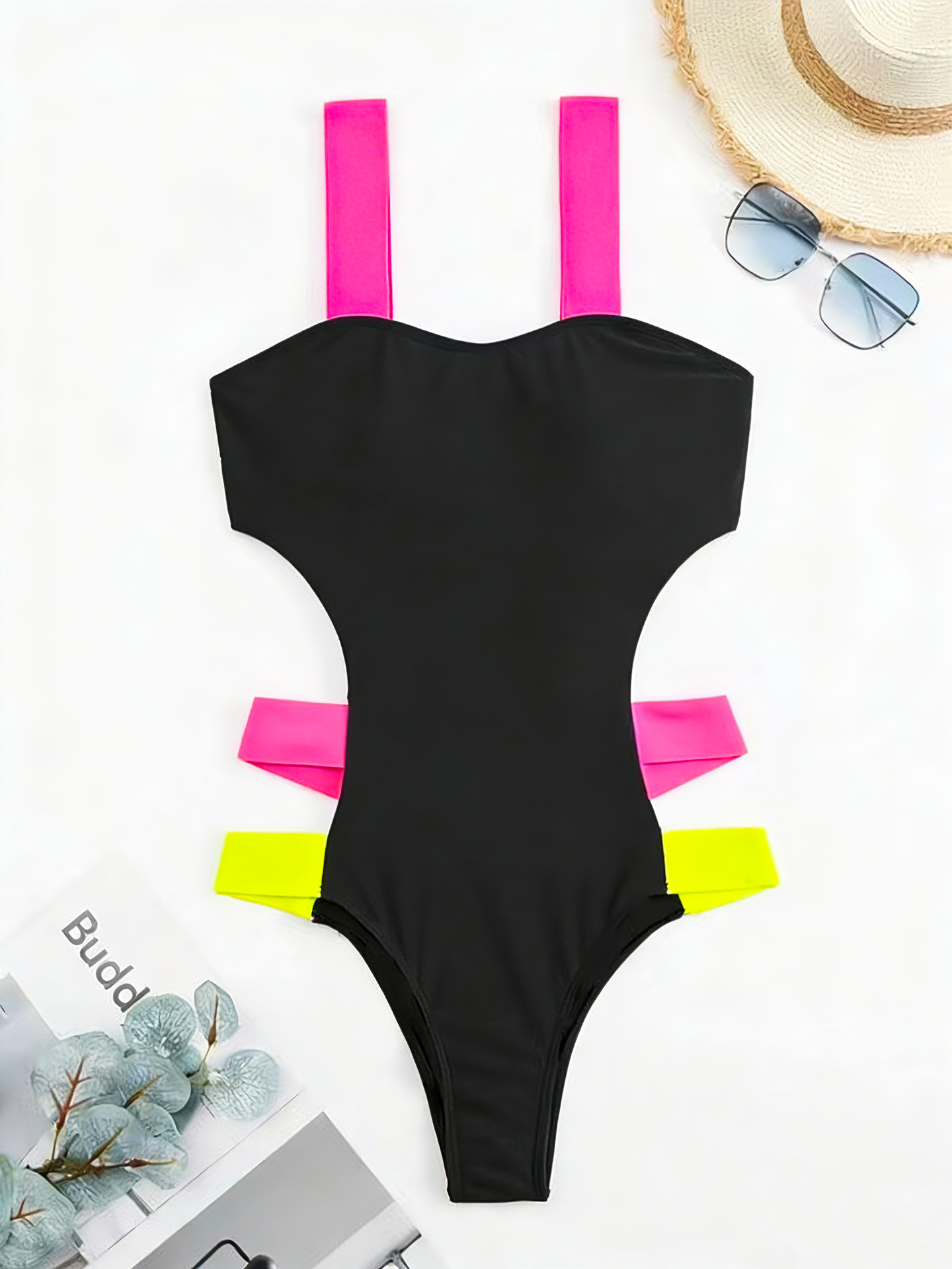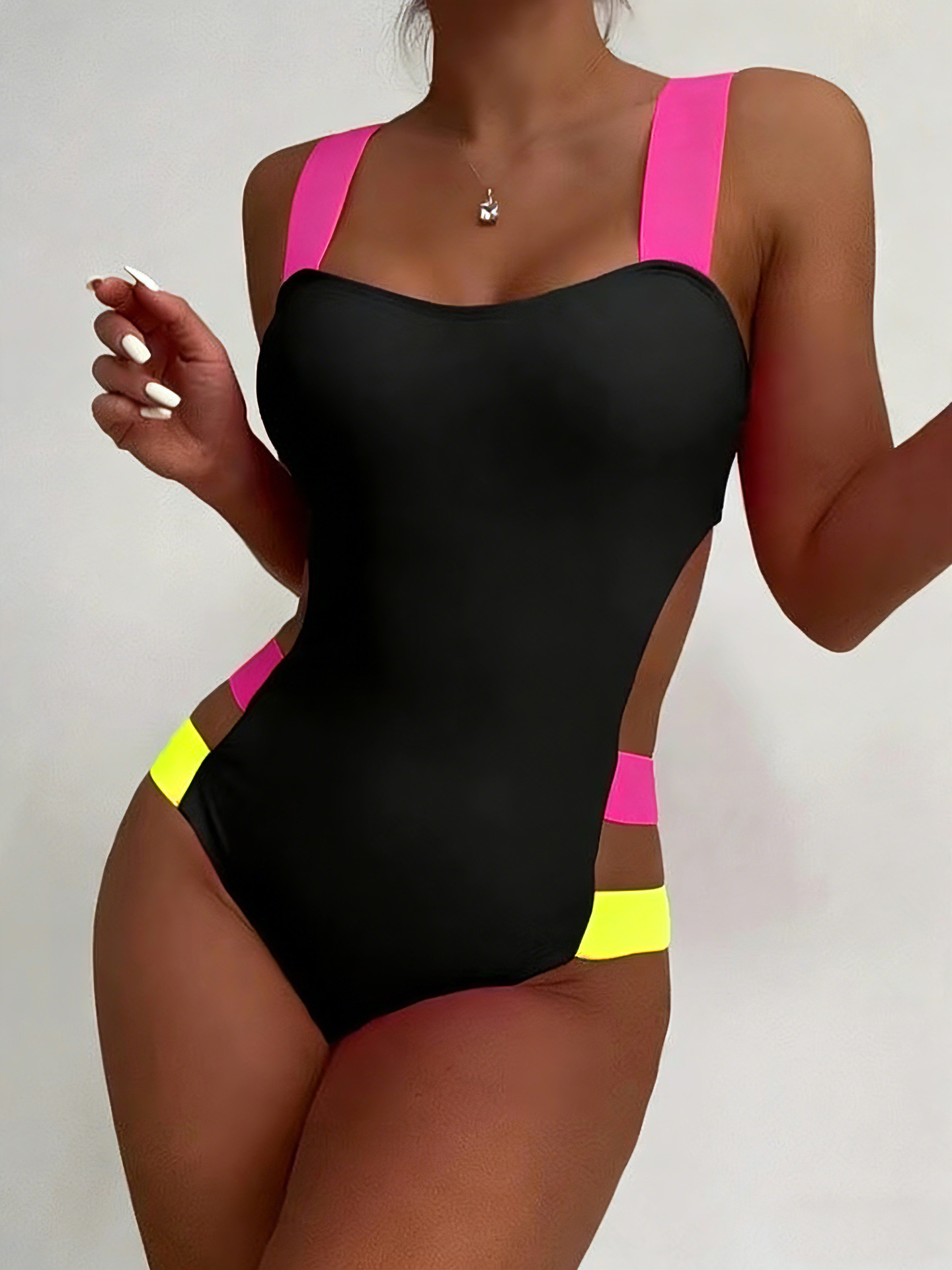 새로운 컬러 유럽과 미국의 뜨거운 소녀 컬러 매칭 보드 벨트 원피스 수영복 여성 백리스 스티칭 대비 컬러 수영복 슬리밍 수영