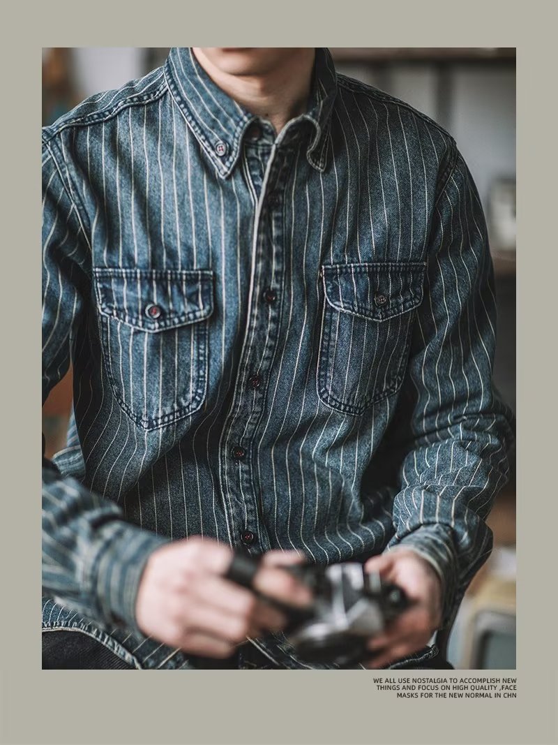 세탁 된 복고풍 세로 줄무늬 데님 셔츠 남성 봄과 가을 미국 패션 브랜드 스트리트 느슨한 올 매치 캐주얼 작업복 재킷