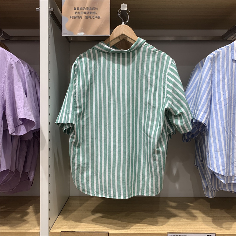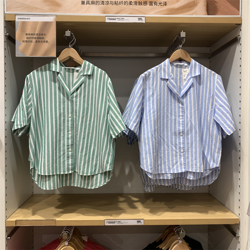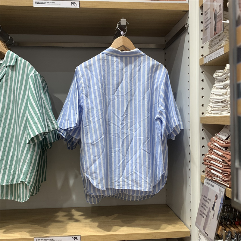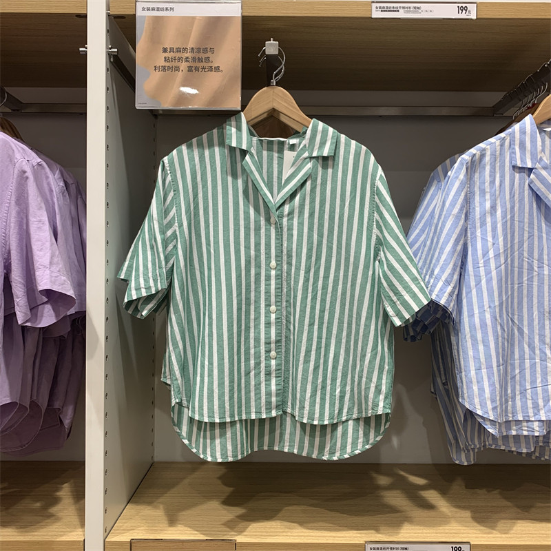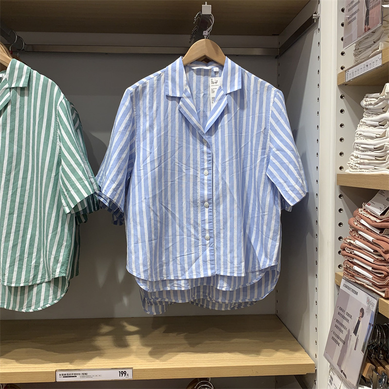 피팅 룸 일본식 2023 여름 새로운 스트라이프 오픈 칼라 느슨한 캐주얼 짧은 소매 셔츠 탑 여성용 Y458284스토어 가기