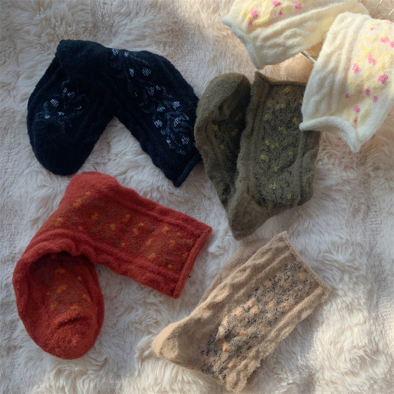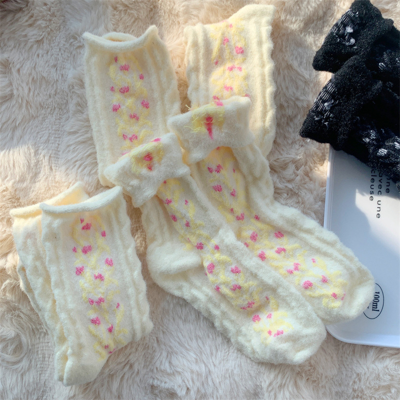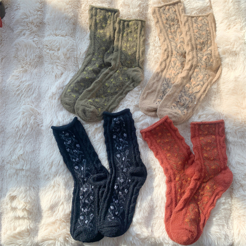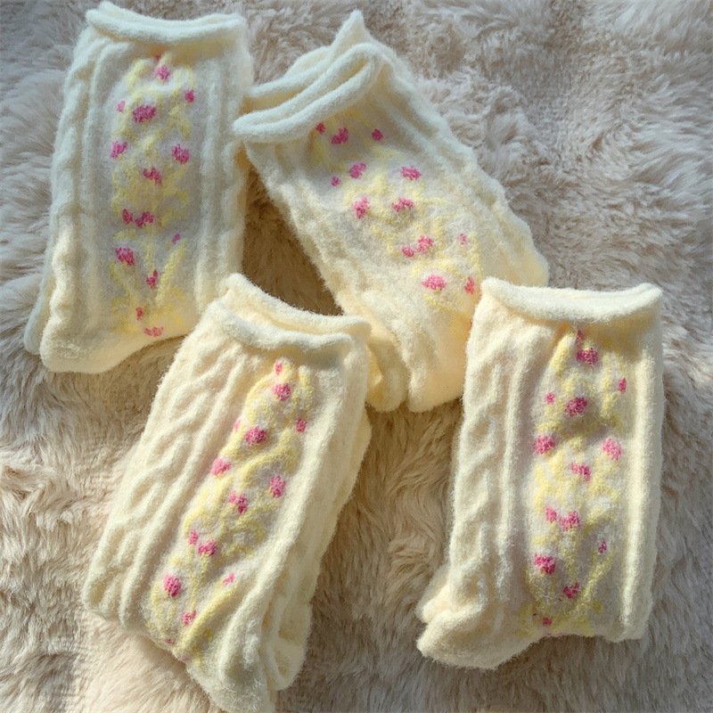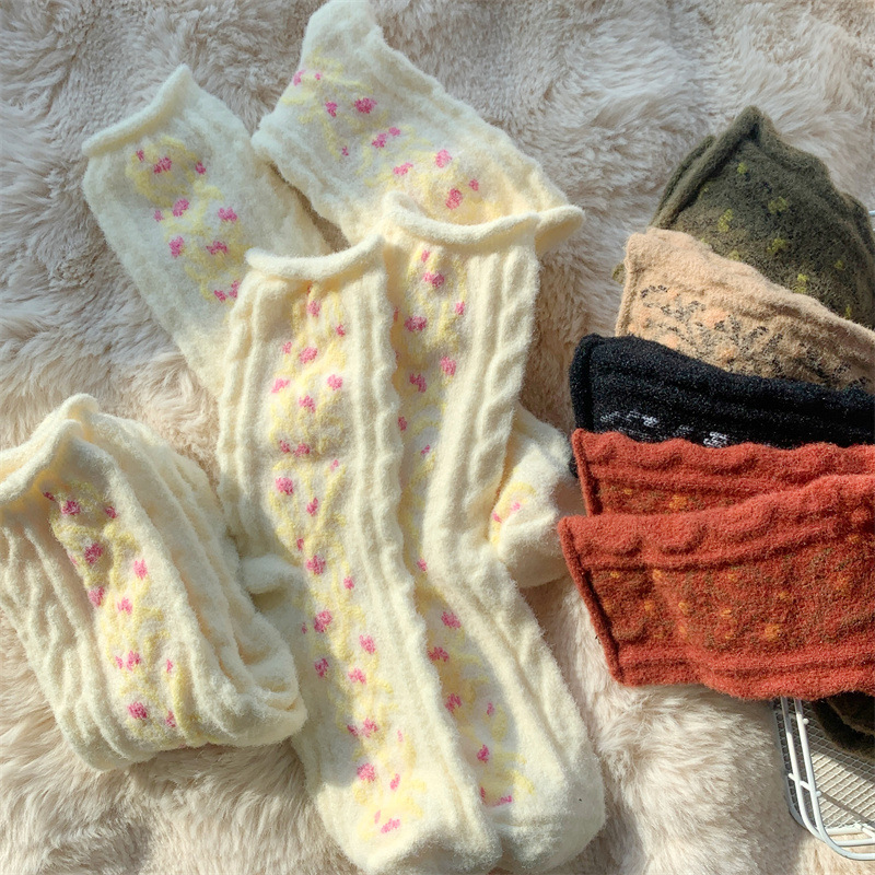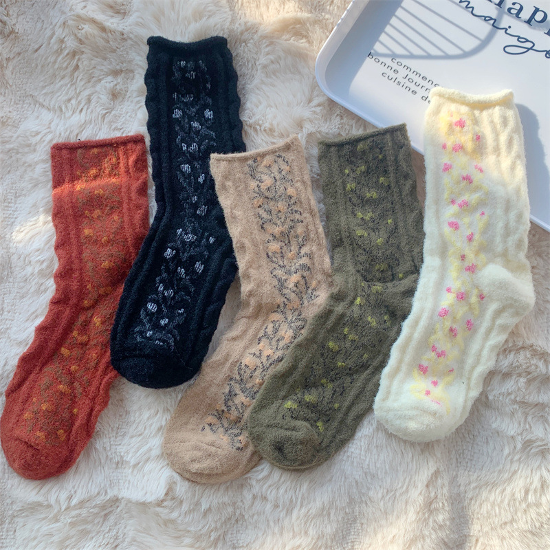 모조 밍크 벨벳 꽃 양말 여성 가을 및 겨울 따뜻한 바닥 양말 빈티지 트위스트 패턴 플러스 벨벳 패딩 튜브 양말