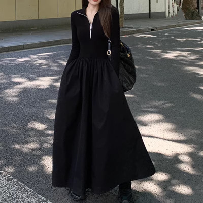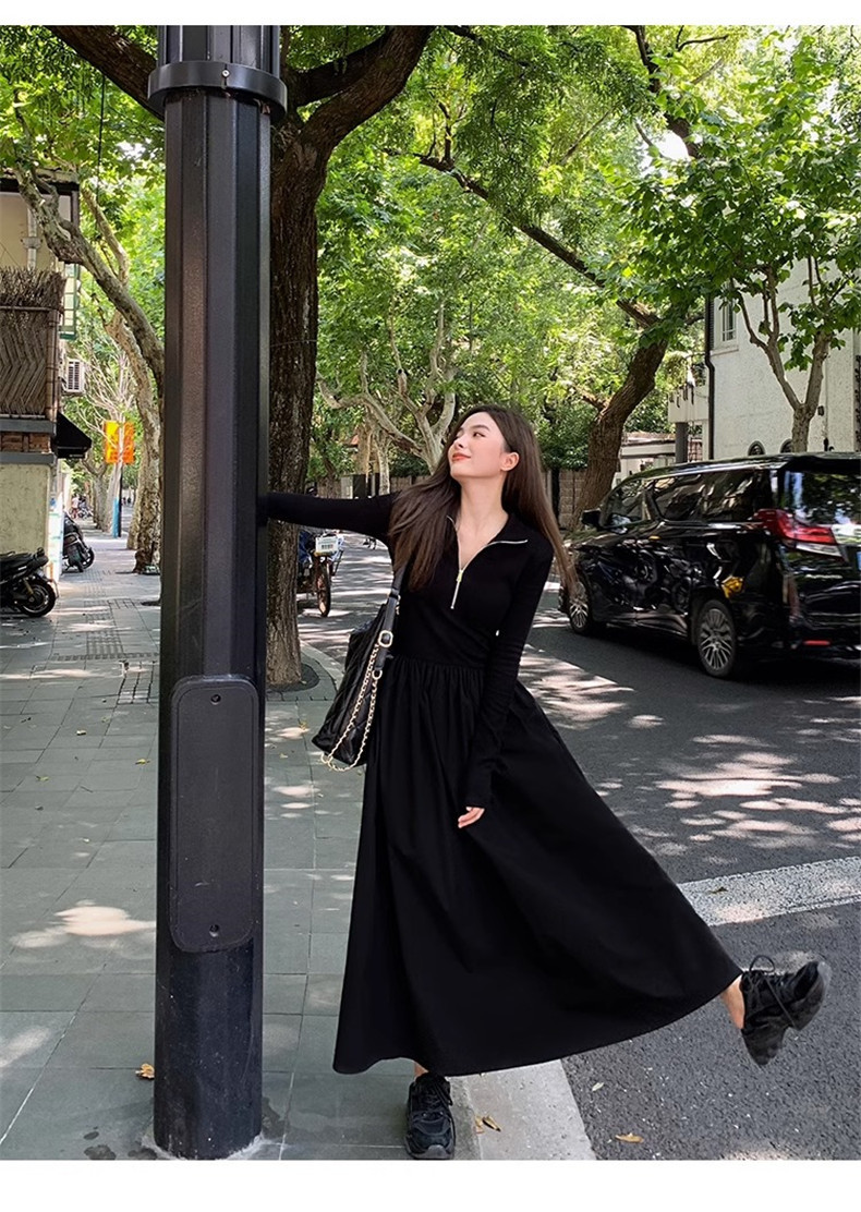 프랑스 헵번 스타일 검은 긴 소매 원피스 여성용 복고풍 느슨한 간단한 슬리밍 지퍼 풀오버 원피스 포켓