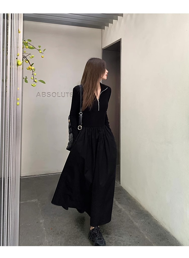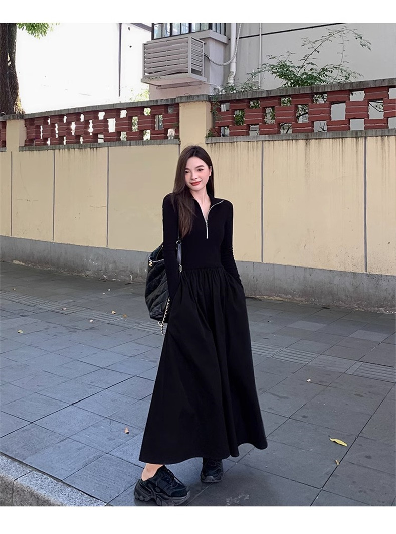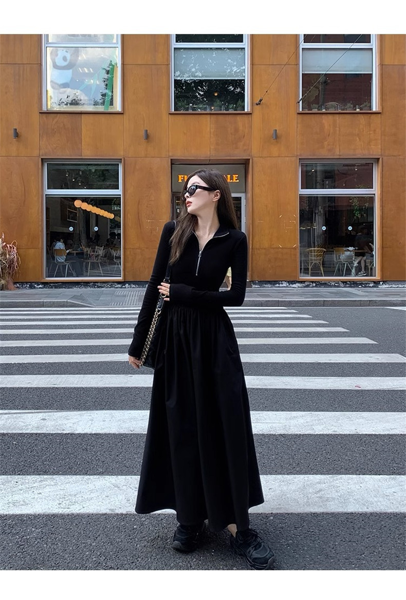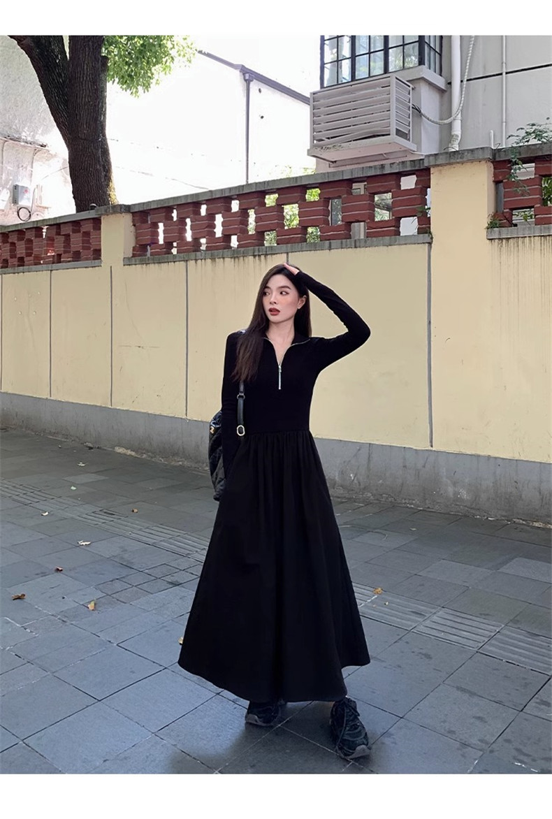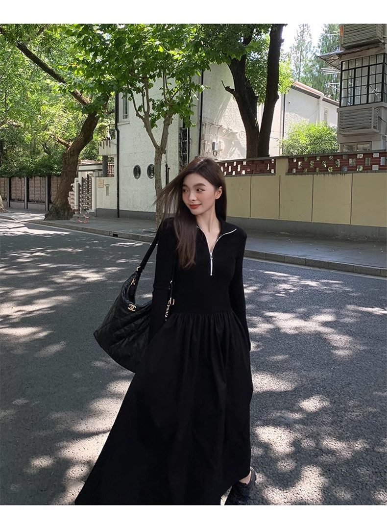 프랑스 헵번 스타일 검은 긴 소매 원피스 여성용 복고풍 느슨한 간단한 슬리밍 지퍼 풀오버 원피스 포켓스토어 가기