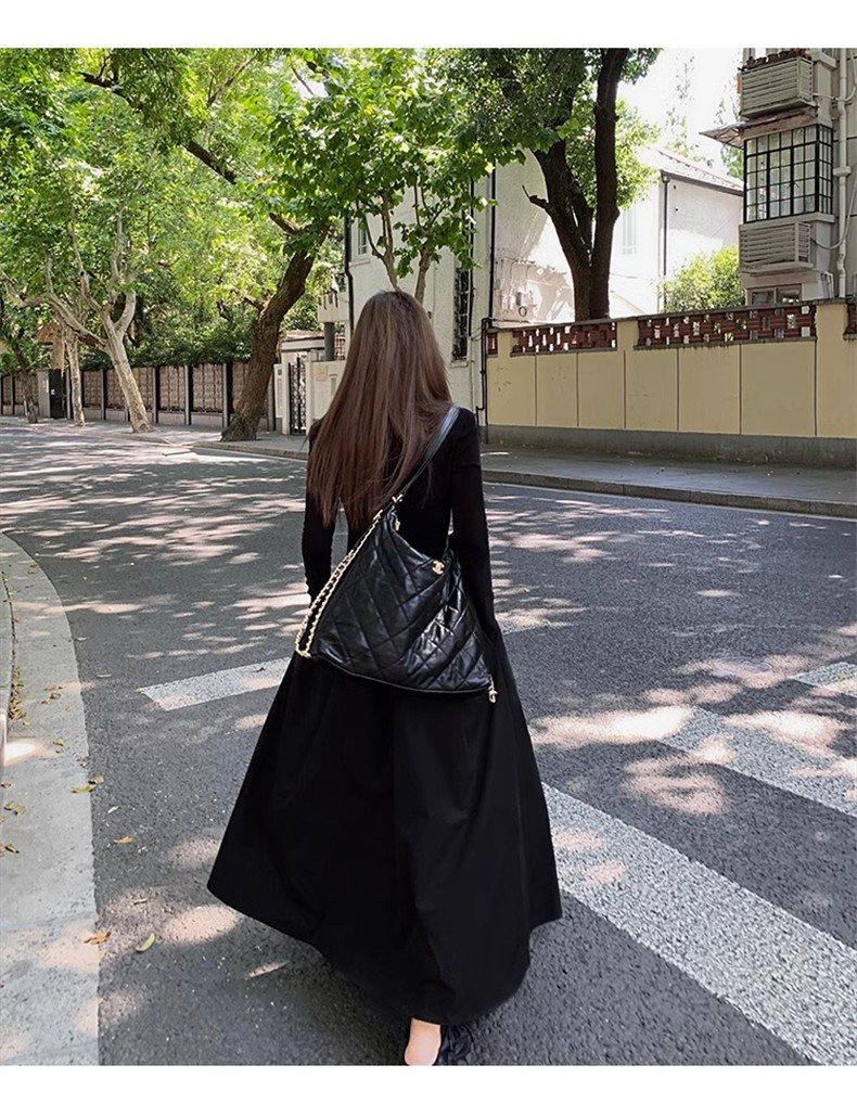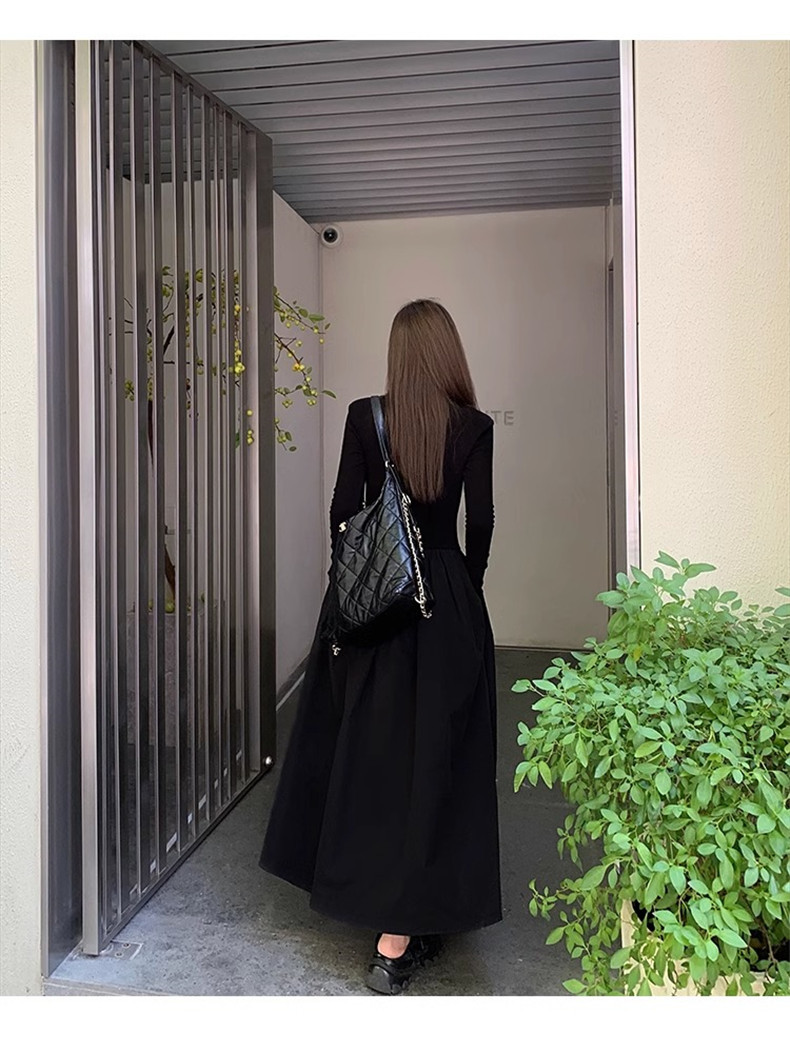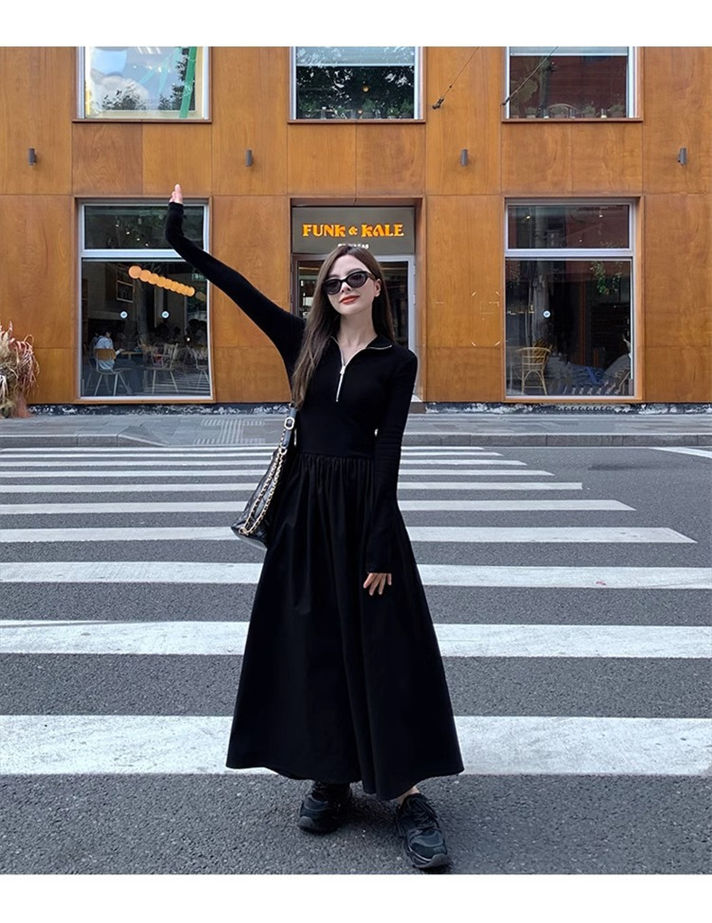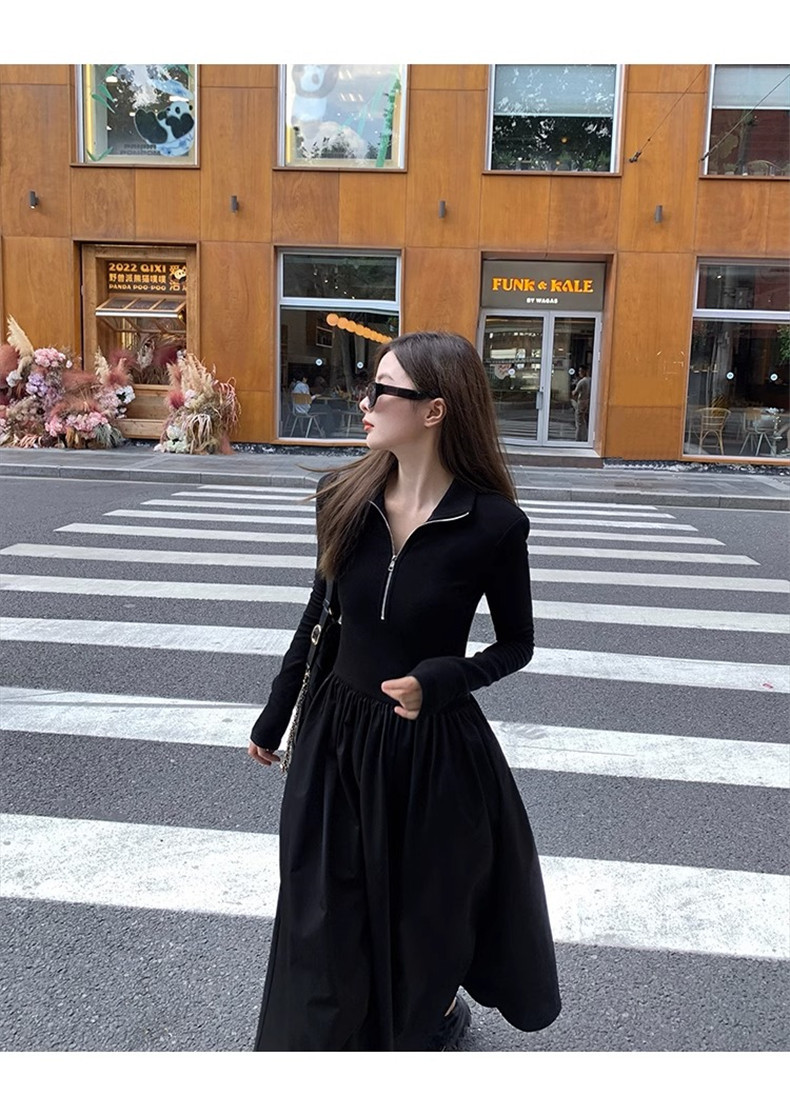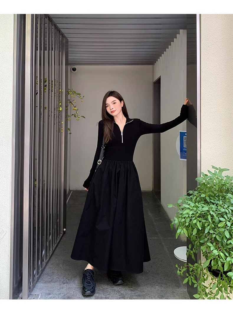 프랑스 헵번 스타일 검은 긴 소매 원피스 여성용 복고풍 느슨한 간단한 슬리밍 지퍼 풀오버 원피스 포켓스토어 가기